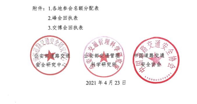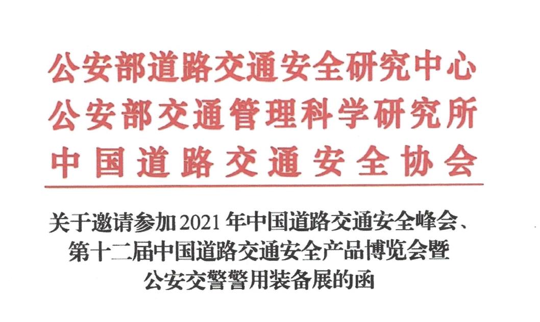 为推动我国道路交通管理和科技信息化建设,提升道路交通安全技术应用水平,加强全国交管科技信息化建设的经验交流,经公安部交通管理局批准,公安部道路交通安全研究中心、公安部交通管理科学研究所、中国道路交通安全协会共同主办的2021年中国道路交通安全峰会(以下简称峰会),定于2021年5月11日在重庆悦来国际会议中心召开;中国道路交通安全协会主办的第十二届中国道路交通安全产品博览会暨公安交警警用装备展(以下简称交博会)及相关论坛,定于5月12日-14日在重庆国际博览中心举办。诚邀贵单位组织人员参加峰会、交博会及相关论坛。现将有关事项函告如下: