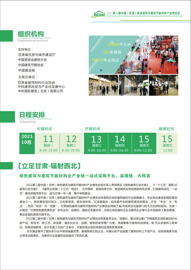 2021第二届中国(甘肃)绿色建筑与建筑节能材料产业博览会将是西北地区建筑建材行业规模最大,专业观众最多的国际展览 盛会之一。既各展区相对独立,又共享资源、既自成体系,又深度融合,品类最齐全的建筑装饰类展会,不仅 “专业”与“专 注”,而且“综合”与“完整”。甘肃绿色建筑与建筑节能材料产业博览会得到了省/市政府及住建部门的大力支持和指导。为进一 步推动“甘肃绿色建筑博览会”的专业化、品牌化、国际化发展步伐,为西北地区建材企业与建筑企业等行业市场提供了更加便捷、 更加全面的商贸对接平台。