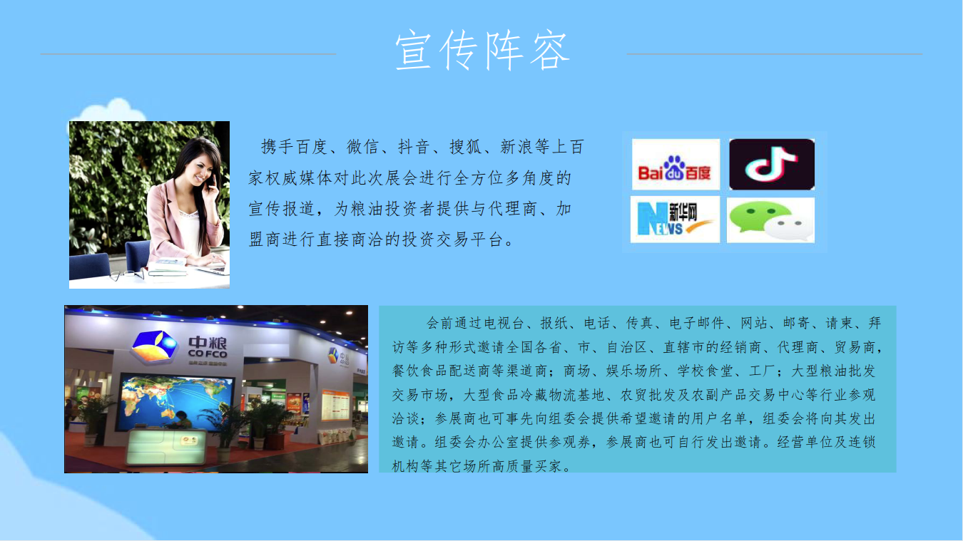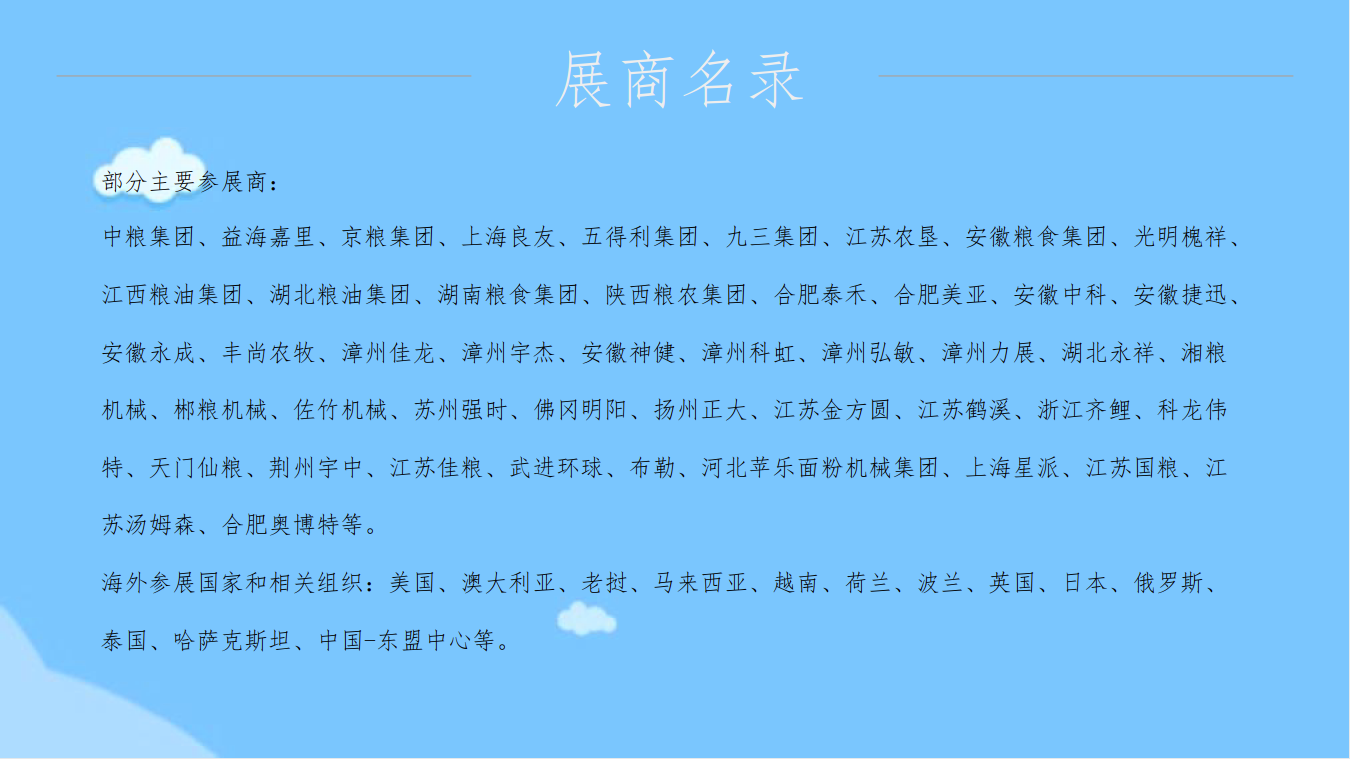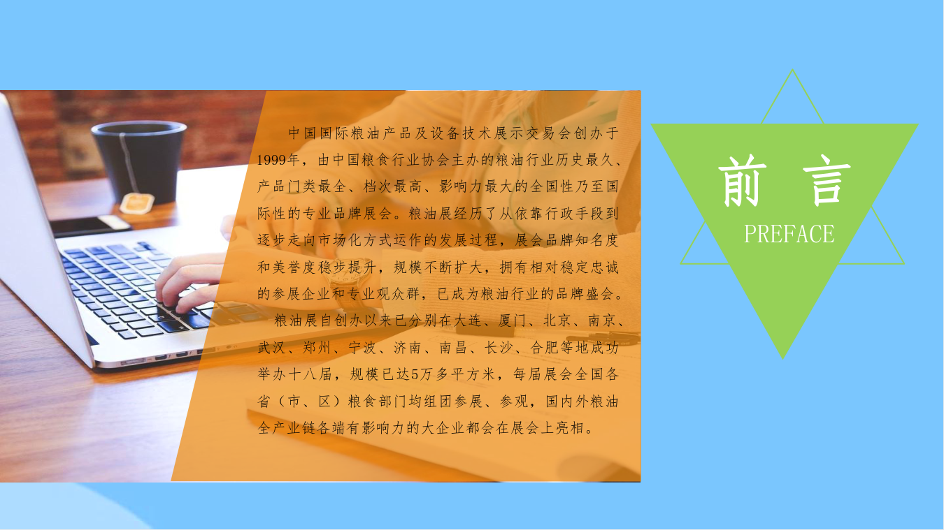 粮油展自创办以来已分别在大连、厦门、北京、南京、 武汉、郑州、宁波、济南、南昌、长沙、合肥等地成功 举办十八届,规模已达5万多平方米,每届展会全国各 省(市、区)粮食部门均组团参展、参观,国内外粮油 全产业链各端有影响力的大企业都会在展会上亮相。