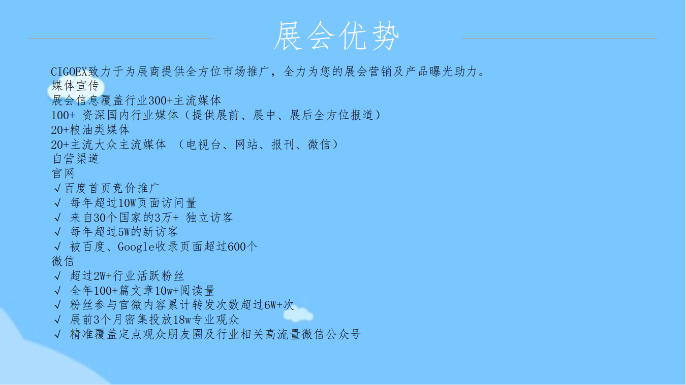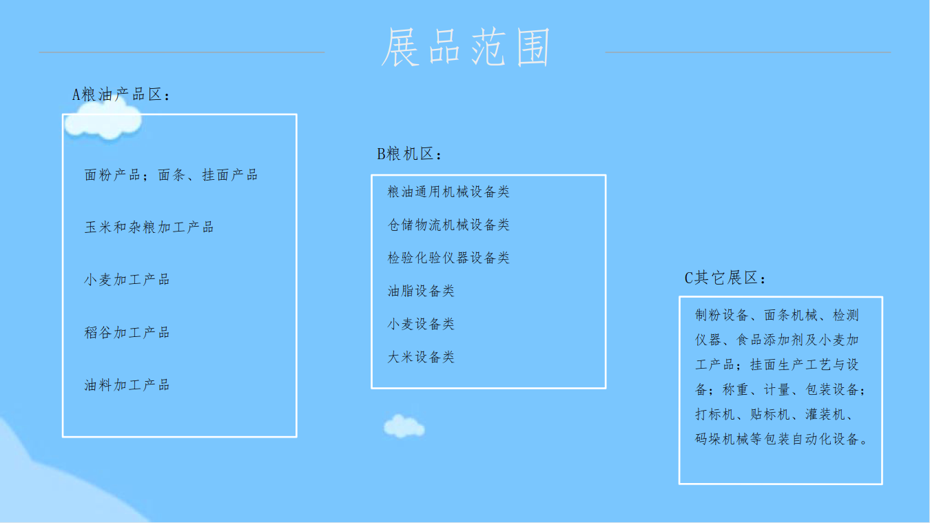 中国国际粮油产品及设备技术展示交易会创办于 1999年,由中国粮食行业协会主办的粮油行业历史最久、 产品门类最全、档次最高、影响力最大的全国性乃至国 际性的专业品牌展会。粮油展经历了从依靠行政手段到 逐步走向市场化方式运作的发展过程,展会品牌知名度 和美誉度稳步提升,规模不断扩大,拥有相对稳定忠诚 的参展企业和专业观众群,已成为粮油行业的品牌盛会。