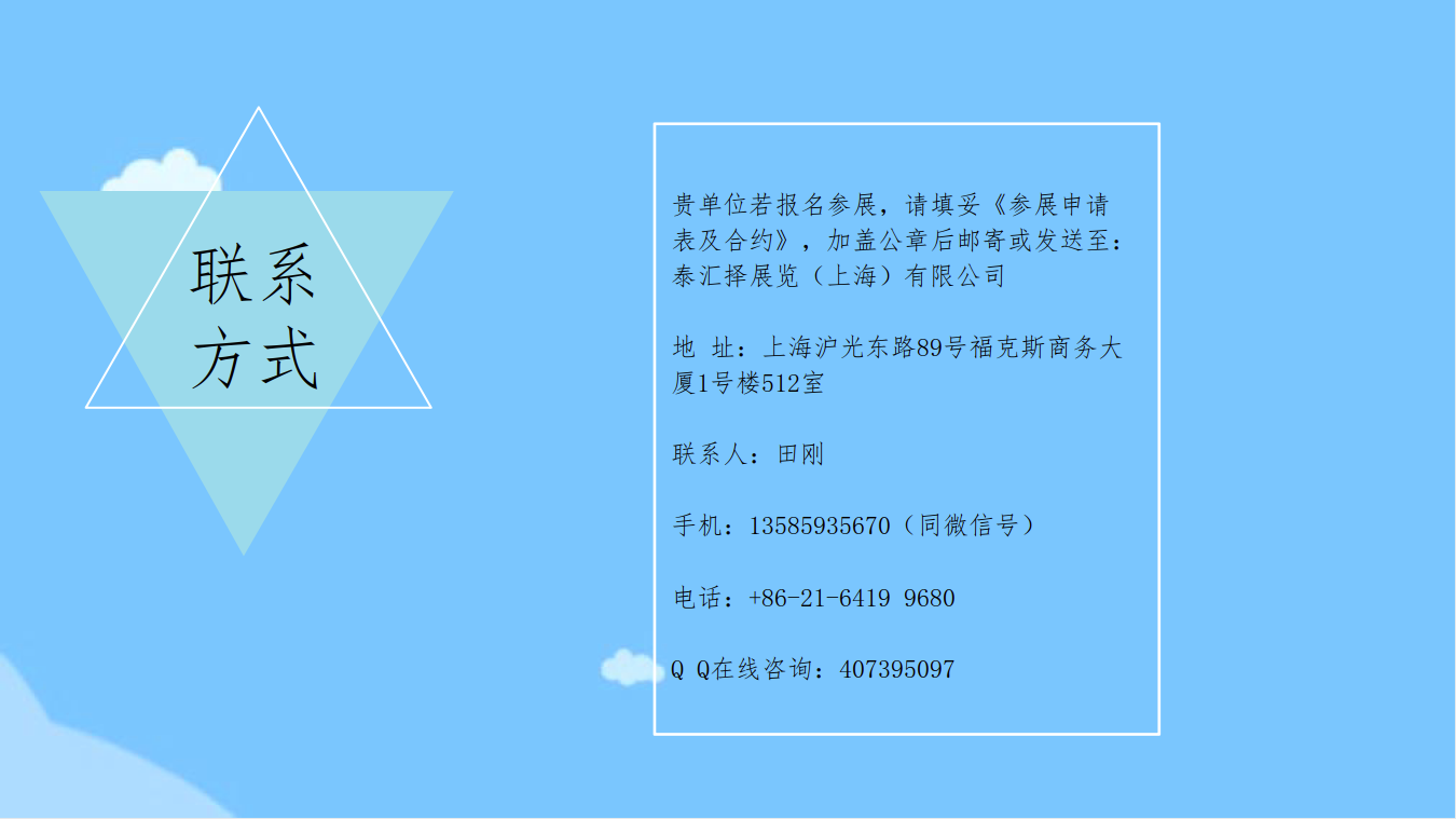 贵单位若报名参展,请填妥《参展申请 表及合约》,加盖公章后邮寄或发送至: 泰汇择展览(上海)有限公司