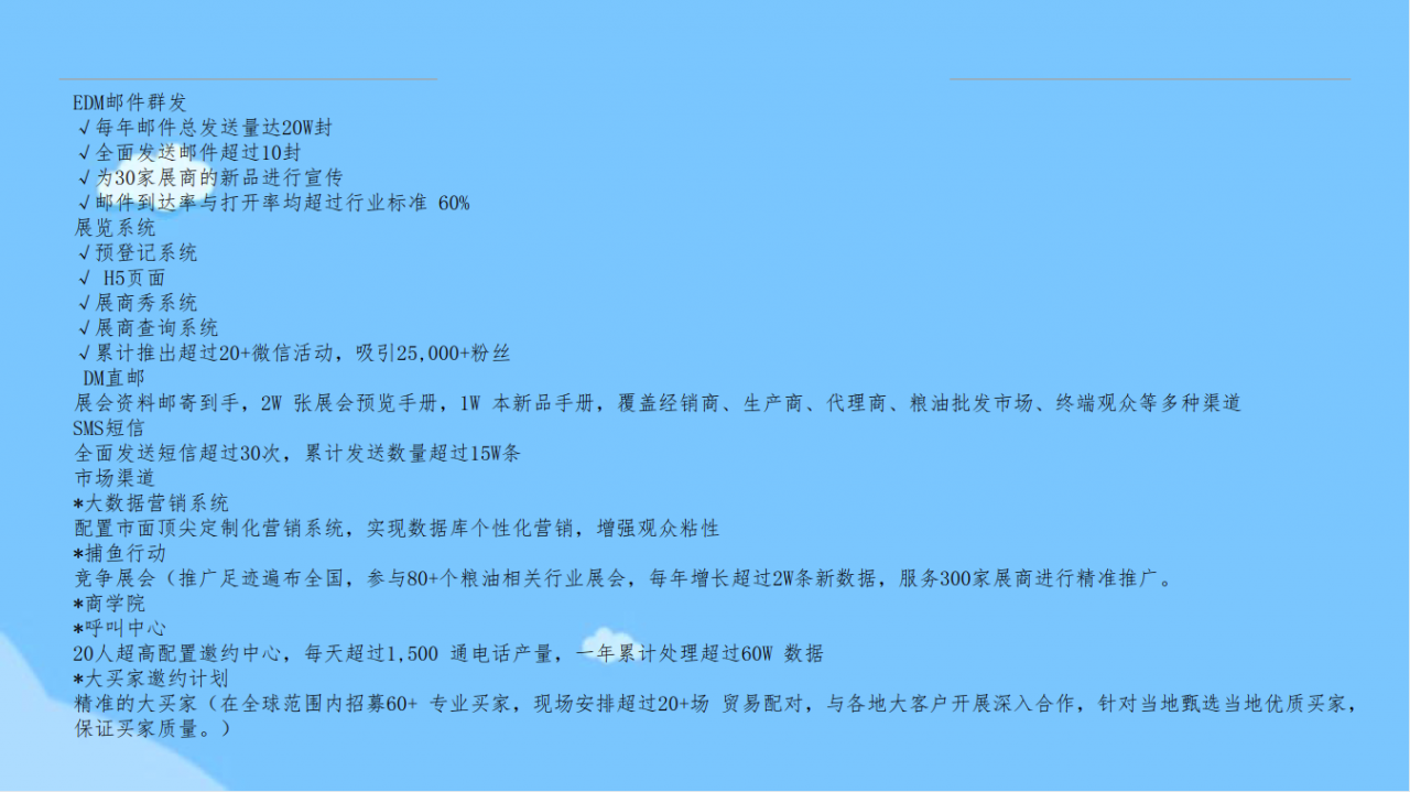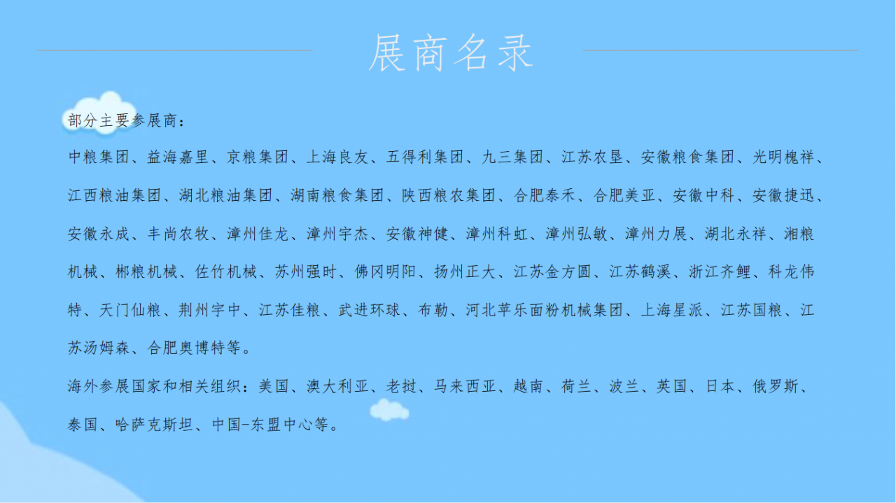 粮油展自创办以来已分别在大连、厦门、北京、南京、 武汉、郑州、宁波、济南、南昌、长沙、合肥等地成功 举办十八届,规模已达5万多平方米,每届展会全国各 省(市、区)粮食部门均组团参展、参观,国内外粮油 全产业链各端有影响力的大企业都会在展会上亮相。