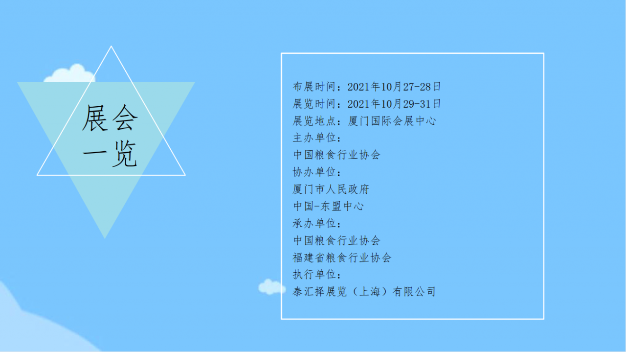 内容摘要: 2021第19届中国国际粮油产品及设备技术展示交易会 时间:2021年10月29-31日 地点:厦门国际会展中心 中国国际粮油产品及设备技术展示交易会创办于1999年,由中国粮食行业协会主办的粮……
