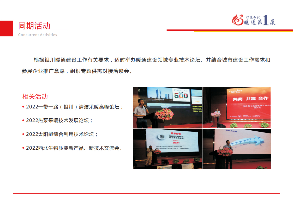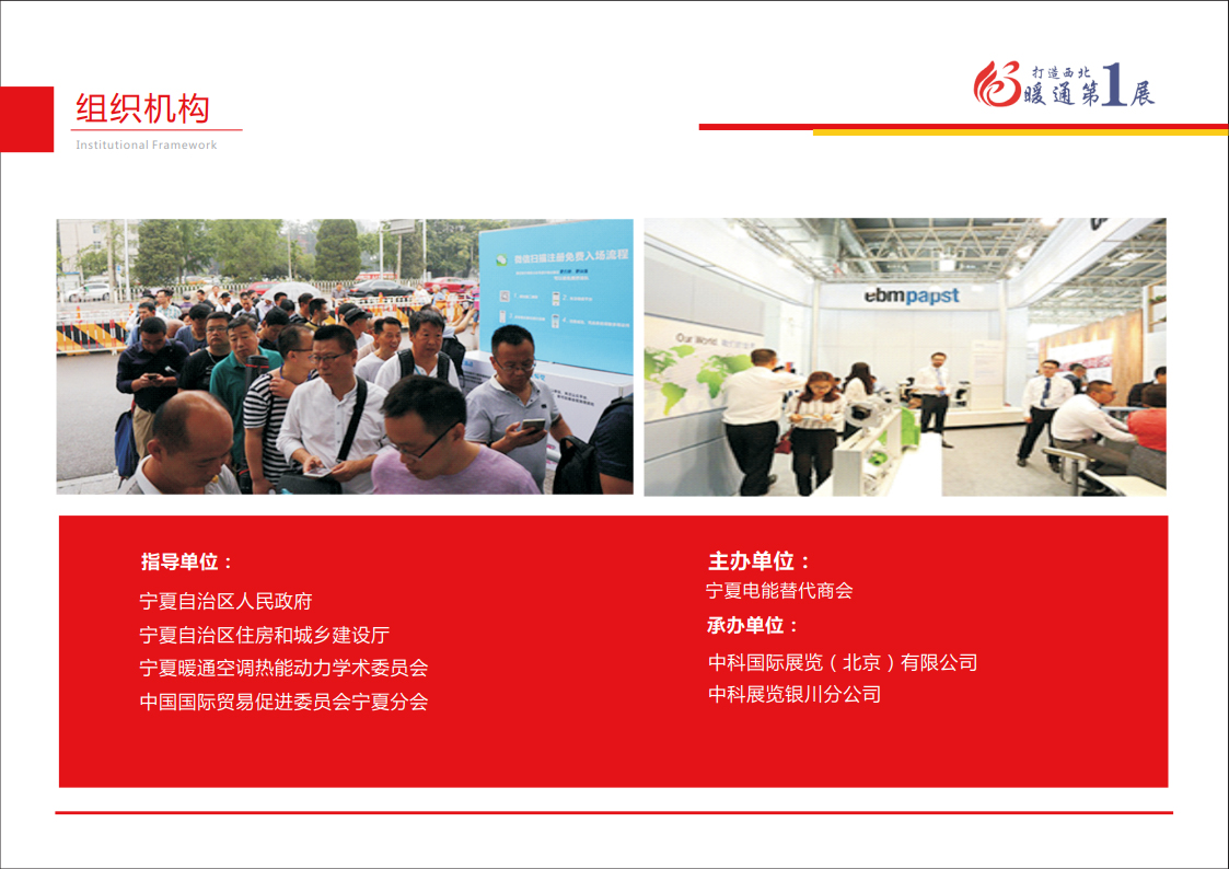回顾2021砥砺奋进,“宁夏暖通展”是西北清洁取暖行业年度盛会,上届活 动共吸引了:浙江正理生能、美的、奥立、远大阀门、广东华天成、荣事达、北京天韵太阳能、广东TCL智能暖通、欧思丹、澳信、山东琅卡博能源、未蓝、日创友康、 宏丰机械、山西晋星热能、山西奥通、阿咪吧、维而特、宁波爱握乐热能、正森、泰 和美、在宇工贸、盛太、太阳雨、中科福德、格美、金春水暖、七杰、宇坤、佳宝、 山西暖圣热能、银川艾尼工业科技、山东柯瑞思、暖贝尔、宁波德业等多家知名参 展商,展会面积突破15000平米,会展期间吸引了政府相关采购部门、地域经销商、 区域代理商、暖通工程公司、市政管理、房地产开发商、热力公司、楼宇物业管理等 专业观众现场参观洽谈,汇聚冷暖铸辉煌,银川暖通展引领西北煤改清洁能源风向标 ,推动宁夏多元化新型采暖技术发展,瞻望2022再创辉煌!