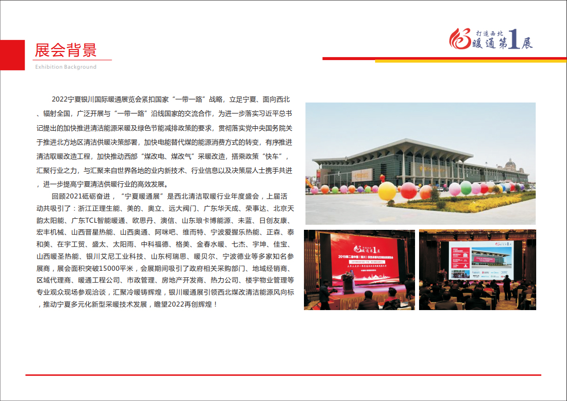 2022宁夏银川国际暖通展览会紧扣国家“一带一路”战略,立足宁夏、面向西北 、辐射全国,广泛开展与“一带一路”沿线国家的交流合作,为进一步落实习近平总书记提出的加快推进清洁能源采暖及绿色节能减排政策的要求,贯彻落实党中央国务院关 于推进北方地区清洁供暖决策部署,加快电能替代煤的能源消费方式的转变,有序推进 清洁取暖改造工程,加快推动西部“煤改电、煤改气”采暖改造,搭乘政策“快车”, 汇聚行业之力,与汇聚来自世界各地的业内新技术、行业信息以及决策层人士携手共进 ,进一步提高宁夏清洁供暖行业的高效发展。