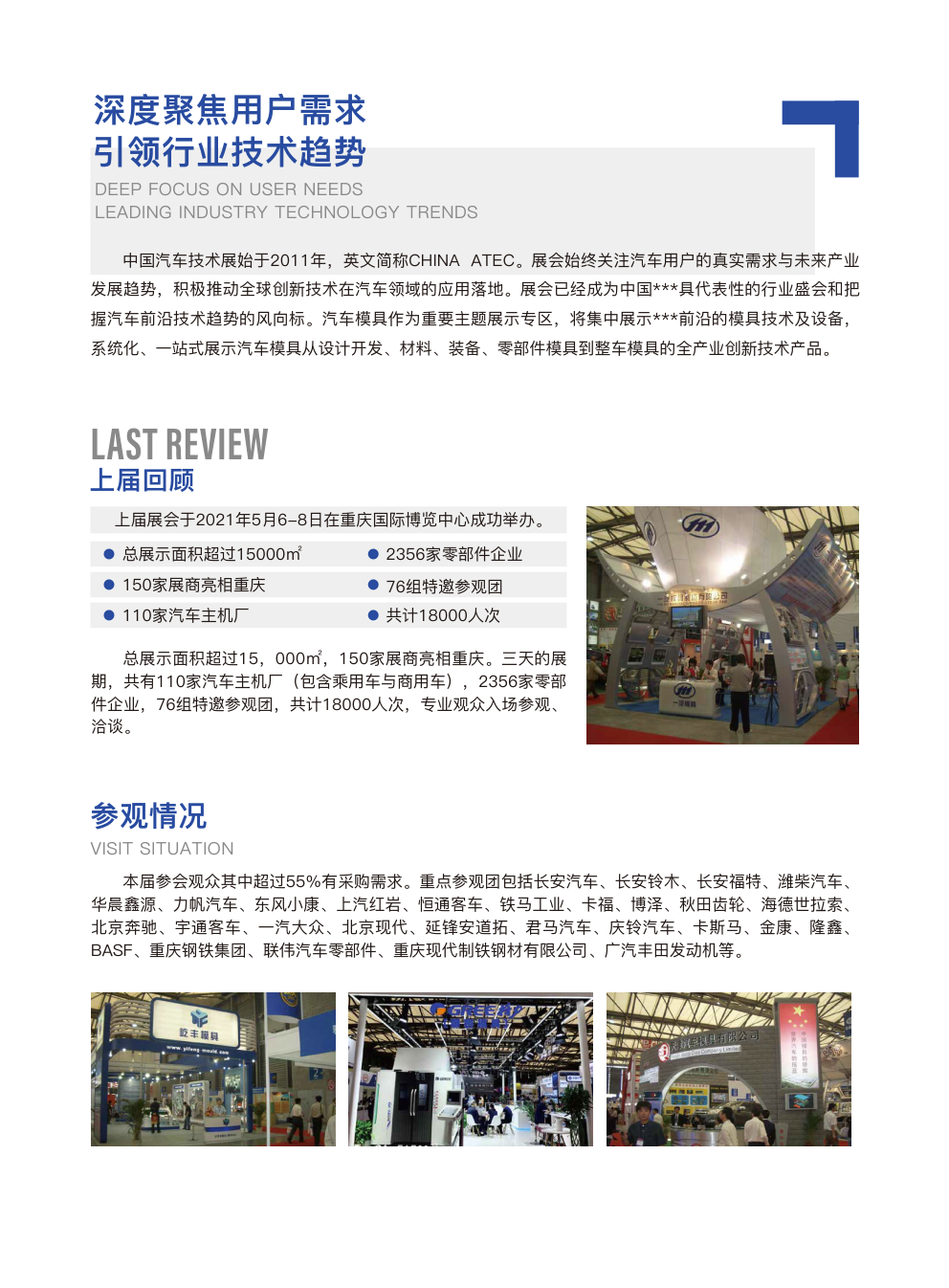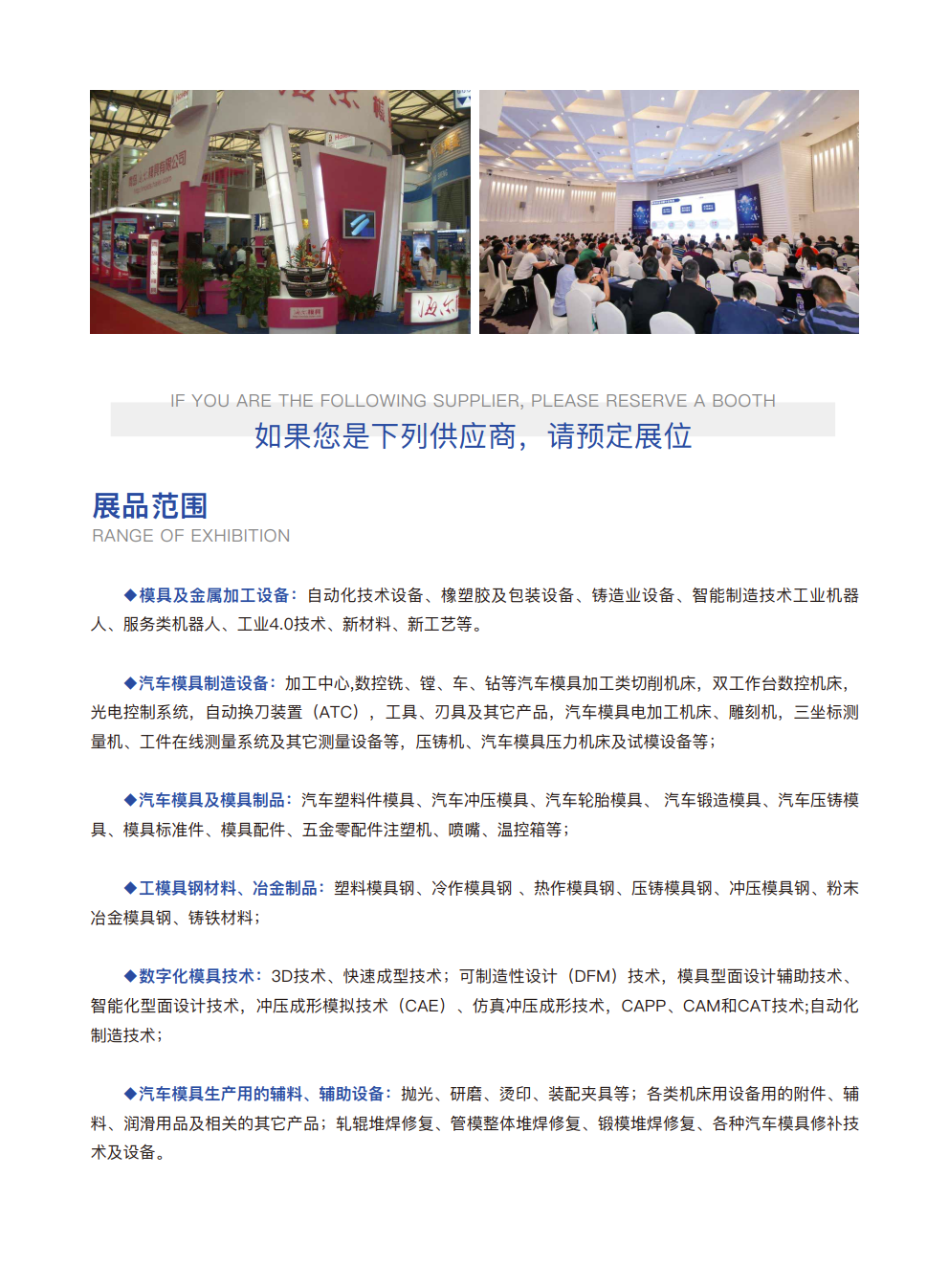 中国汽车技术展始于2011年,英文简称CHINA ATEC。展会始终关注汽车用户的真实需求与未来产业 发展趋势,积极推动全球创新技术在汽车领域的应用落地。展会已经成为中国***具代表性的行业盛会和把 握汽车前沿技术趋势的风向标。汽车模具作为重要主题展示专区,将集中展示***前沿的模具技术及设备, 系统化、一站式展示汽车模具从设计开发、材料、装备、零部件模具到整车模具的全产业创新技术产品。
