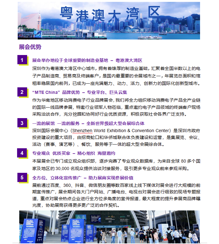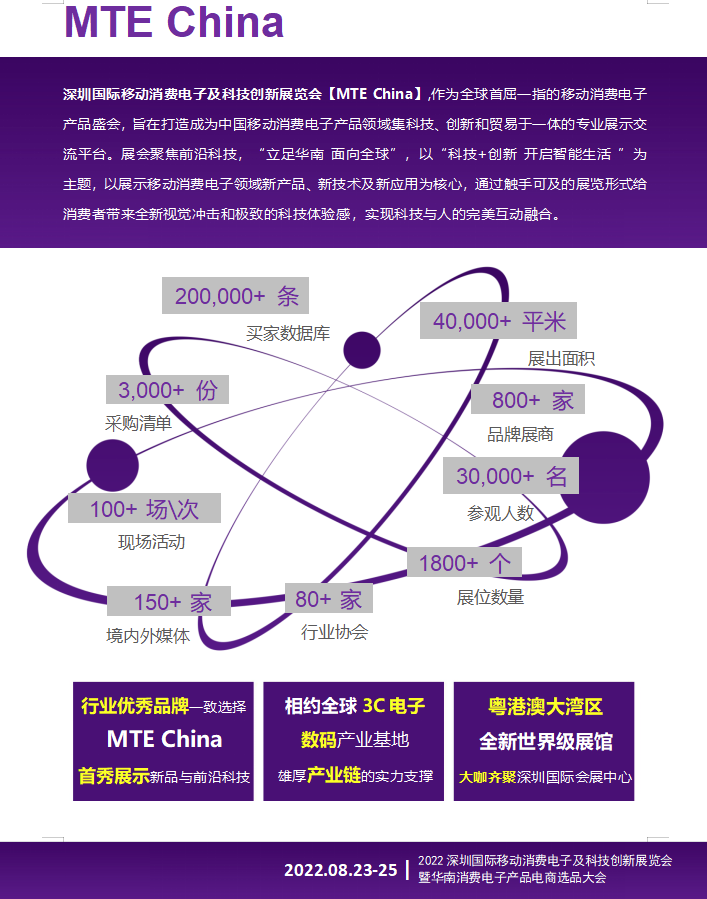 深圳国际移动消费电子及科技创新展览会【MTE China】,作为全球首屈一指的移动消费电子产品盛会,旨在打造成为中国移动消费电子产品领域集科技、创新和贸易于一体的专业展示交流平台。展会聚焦前沿科技,“立足华南 面向全球”,以“科技+创新 开启智能生活 ”为主题,以展示移动消费电子领域新产品、新技术及新应用为核心,通过触手可及的展览形式给消费者带来全新视觉冲击和极致的科技体验感,实现科技与人的完美互动融合。