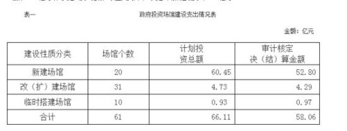 深圳大运会共使用63个场馆,其中政府投资新建、改(扩)建及临时搭建场馆61个,企业投资新建场馆1个,企业现有场馆1个。场馆建设支出共计75.20亿元。政府投资建设的61个场馆计划总投资66.11亿元,实际支出58.06亿元。其中:新建场馆20个,支出52.80亿元;改(扩)建场馆31个,支出4.29亿元;临时搭建场馆10个,支出0.97亿元。而企业投资新建的深圳湾体育中心,尚未完成项目决算,按大运会实际使用场馆分摊的项目概算17.14亿元计入大运会支出总额。