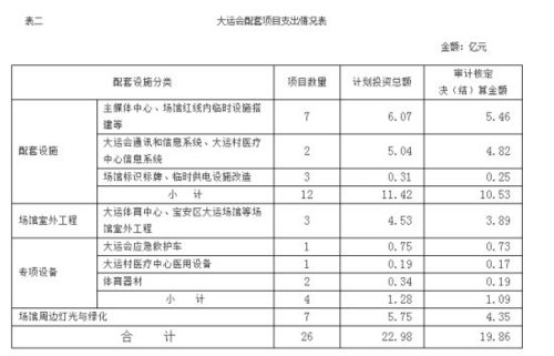 而与大运会赛事直接相关的配套设施、专项设备、场馆室外工程、场馆周边灯光与绿化工程等项目共26个,计划投资总额22.98亿元,实际支出19.86亿元。