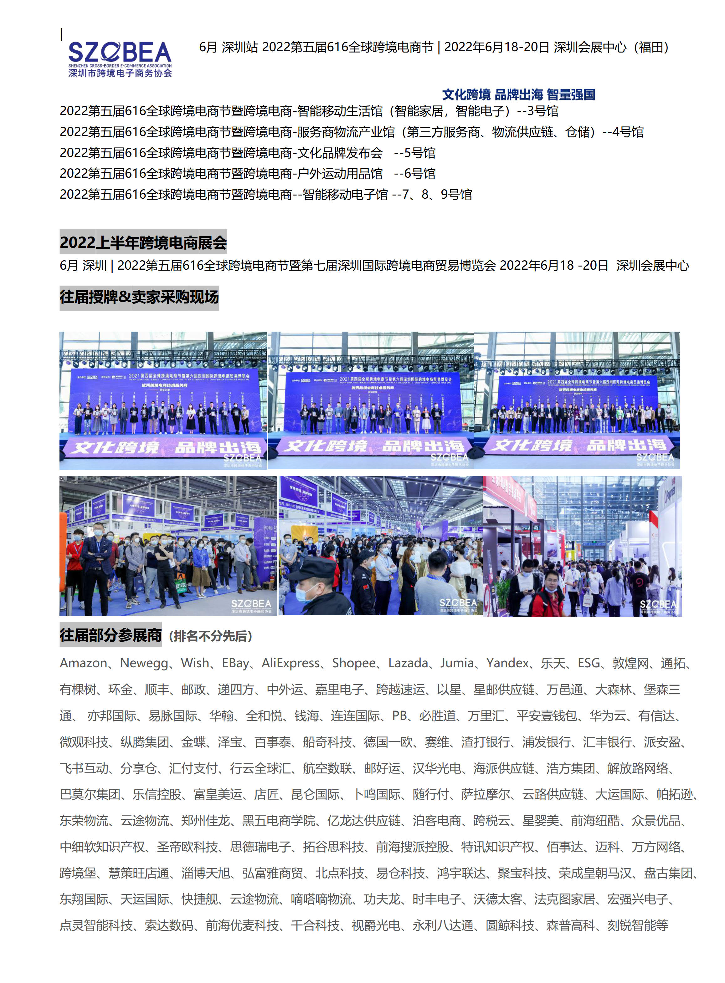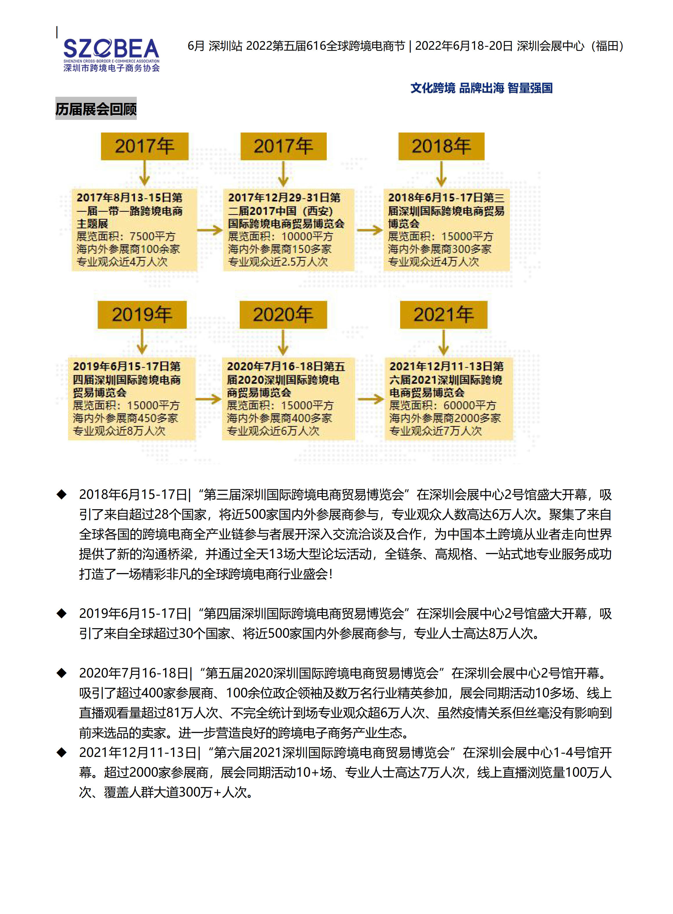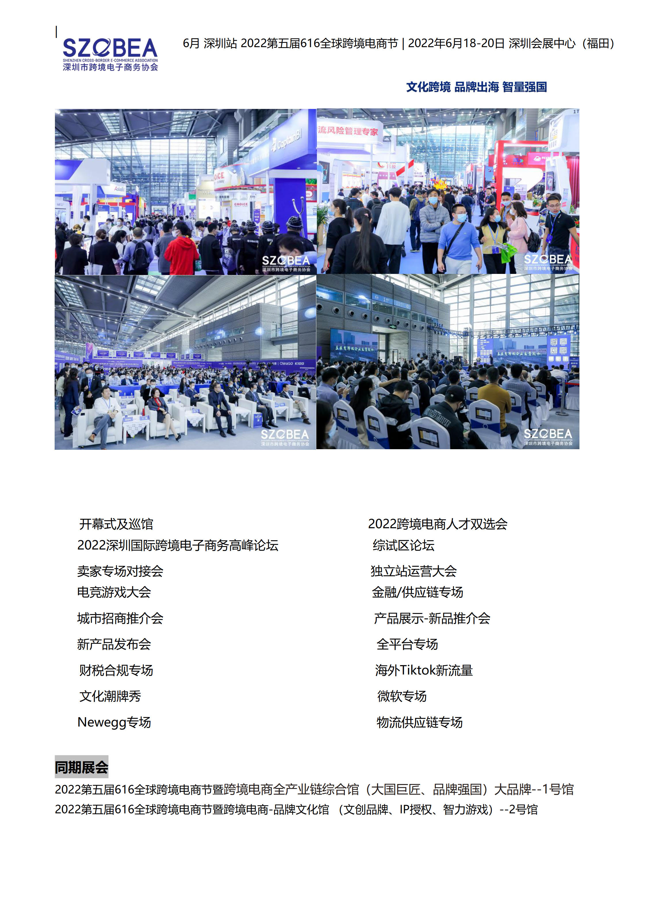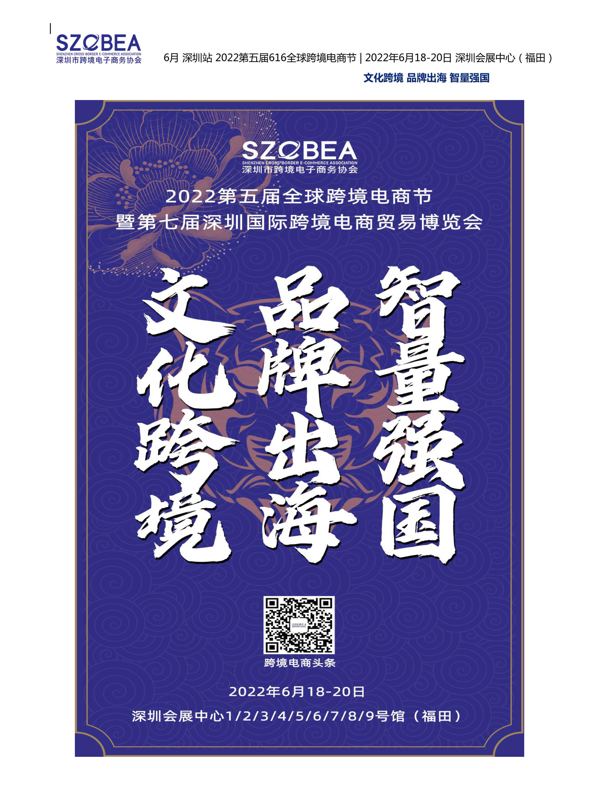 616全球跨境电商节暨深圳国际跨境电商贸易博览会由深圳市政府批准,深圳市跨境电子商 务协会(简称“深跨协”)主办的全球跨境电商行业的年度盛会,至今已成功举办六届展会,每年 专业观众超8万人次;从跨境财税、知识产权、跨境物流、海外仓储、金融支付、平台科技、品牌智 造等多角度展示跨境电商全行业最新的商业模式、顶尖的服务能力以及前沿的行业技术,进一步提 升跨境产业高度,力求打造起于深圳、影响全球的跨境电商盛会。
