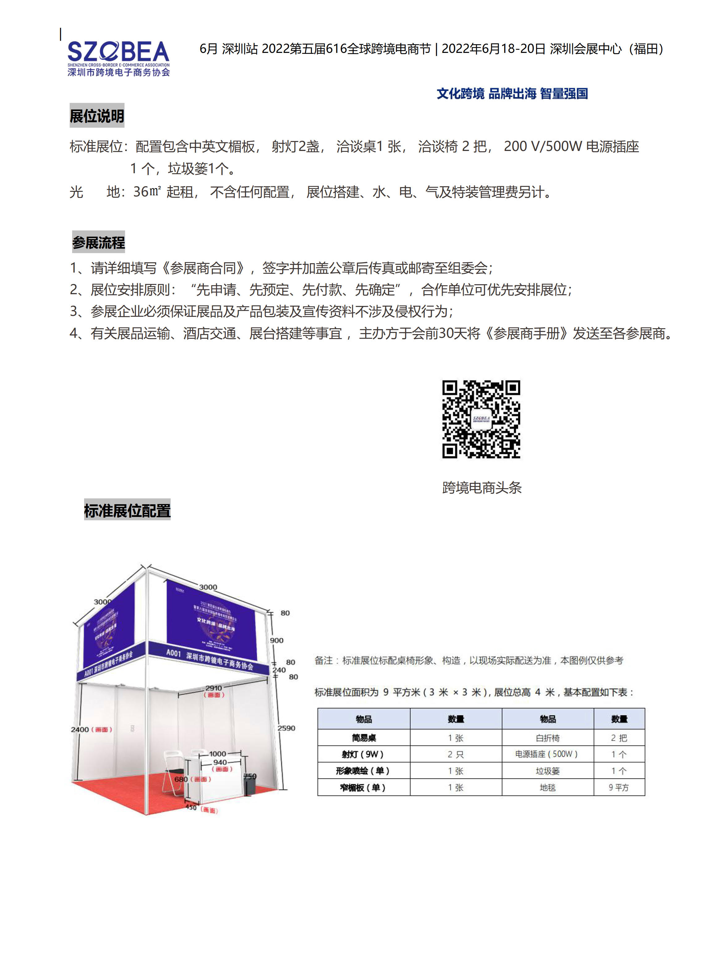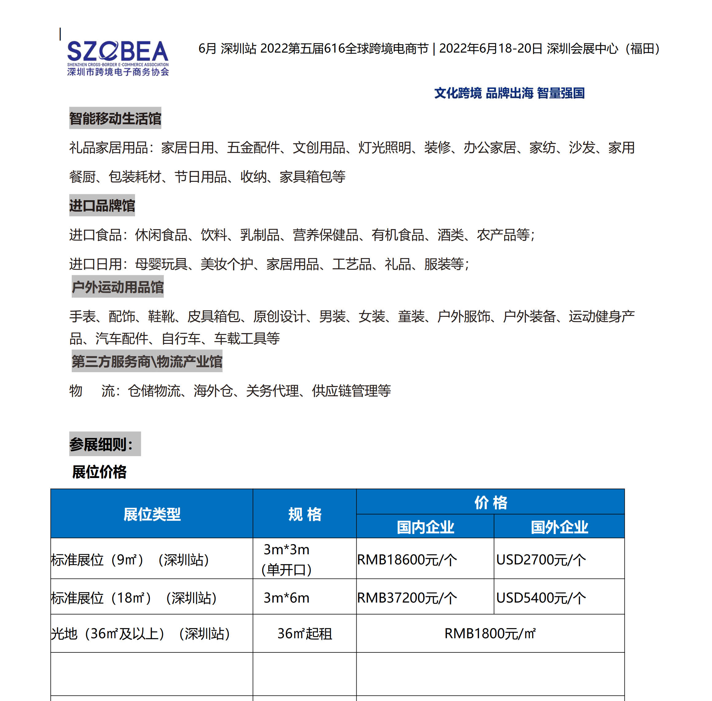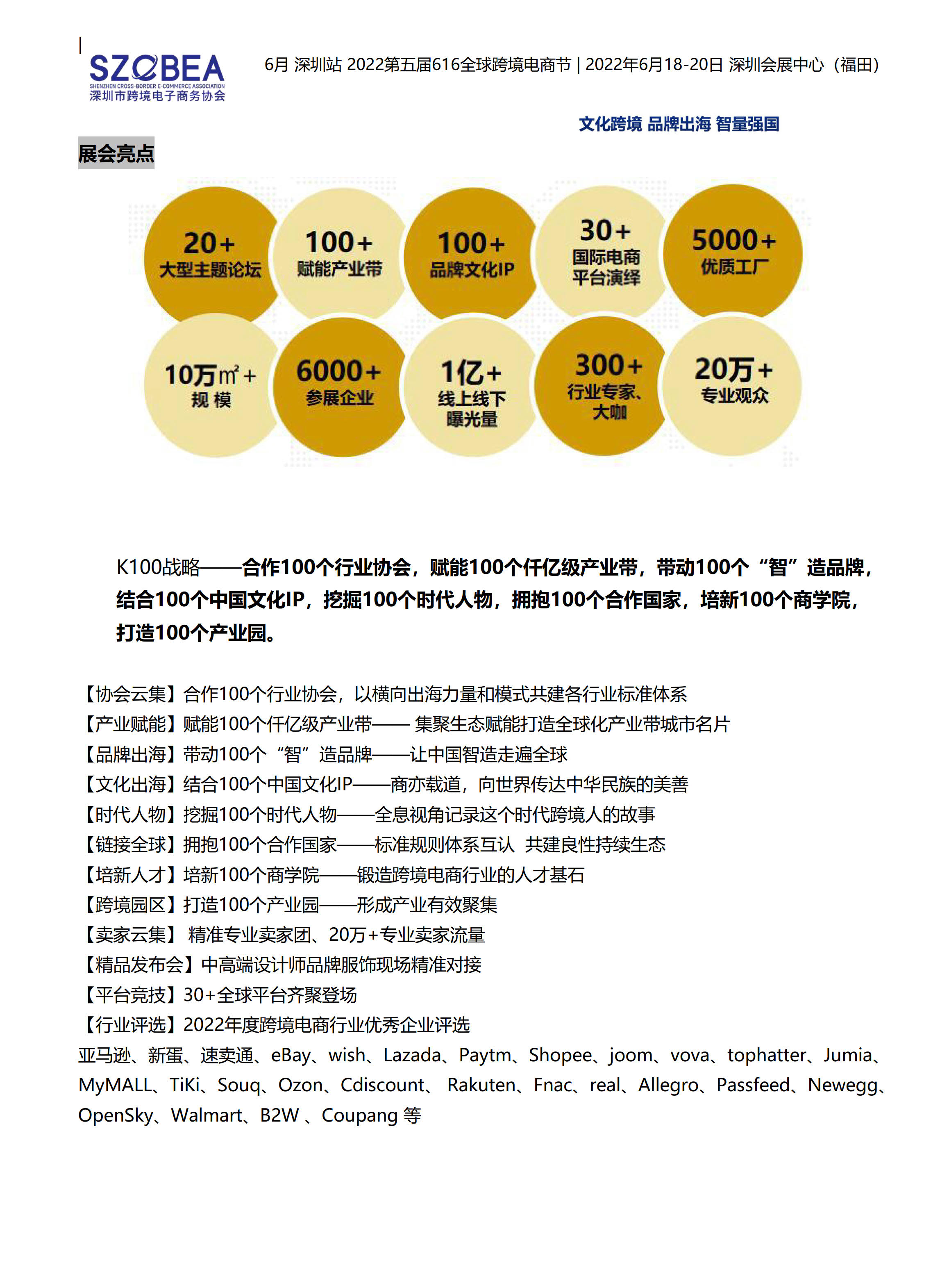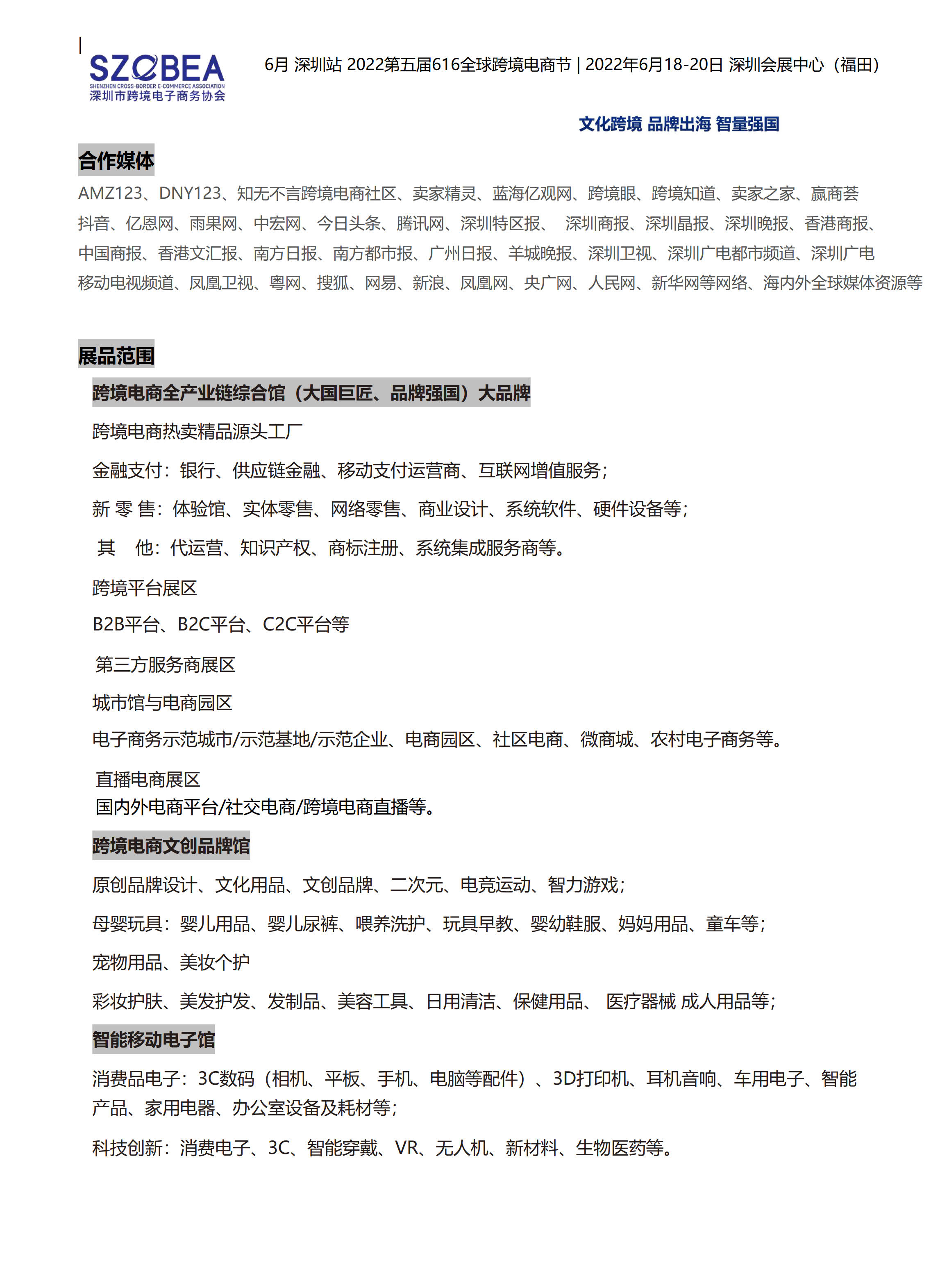 616全球跨境电商节暨深圳国际跨境电商贸易博览会由深圳市政府批准,深圳市跨境电子商 务协会(简称“深跨协”)主办的全球跨境电商行业的年度盛会,至今已成功举办六届展会,每年 专业观众超8万人次;从跨境财税、知识产权、跨境物流、海外仓储、金融支付、平台科技、品牌智 造等多角度展示跨境电商全行业最新的商业模式、顶尖的服务能力以及前沿的行业技术,进一步提 升跨境产业高度,力求打造起于深圳、影响全球的跨境电商盛会。