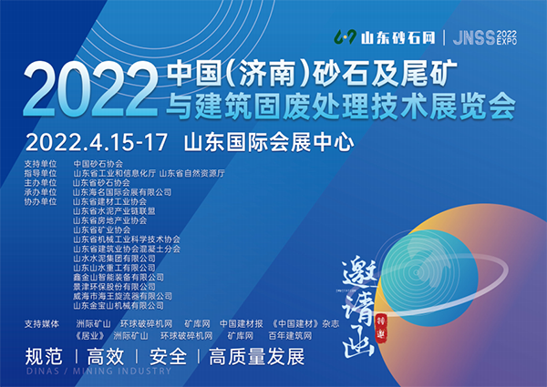 2022年中国(济南)砂石/尾矿与建筑固废处理技术展览会(简称:2022济南砂石展)将于2022年4月15-17日,在山东国际会展中心举办。本届展会由中国砂石协会支持,山东省砂石协会主办,多家省级行业协会协办共同参与,展示行业新技术,共谋未来发展新趋势;此次展会,我们将线上、线下渠道强势推广,打造砂石骨料及矿山和建筑固废处置装备采购一站式平台,为行业企业提供一个集技术设备展示、宣传、推广及采购的全新合作机会。