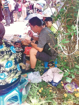 记者看见一些商贩纷纷到会展中心周边摆摊设点,卖玉石等制品。有商贩告诉记者,摆摊没有人过来收费,想摆哪儿摆哪儿。通过观察,记者发现很多摊点主要摆在海明路和关兴路人行道上,影响市民出行,漂亮的绿化带有的被踩成了土路,一些鲜花都被踏平了。有的商贩坐在绿化带里做生意,甚至躺在绿化带里休息。