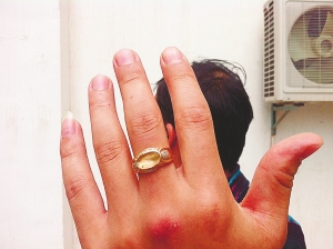 小陈跟男朋友小黄是去石博会看玉石路过时受伤。小陈说:“我朋友当时把电动车靠在路边,打电话给朋友时,来了四五个城管。其男朋友小黄的脖子、右脸等处被打出血、肿胀。”小黄手指上的戒指空空的,玉石戒面不见了。采访时,他已看过门诊,还做了CT检查。