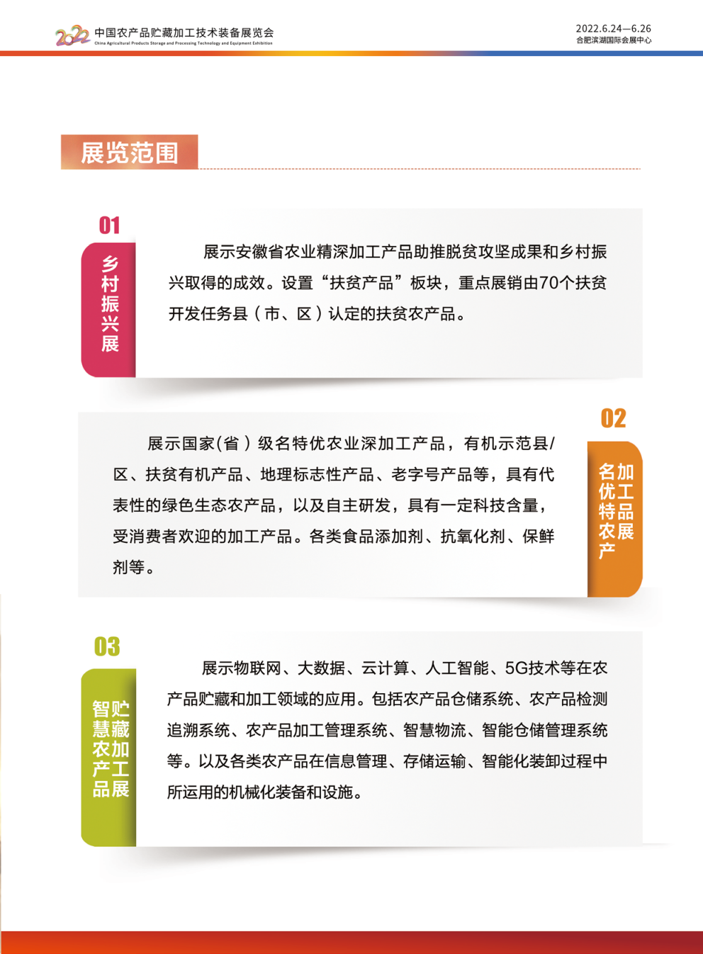 展示国家(省)级名特优农业深加工产品,有机示范县/区 、扶贫有机产品、地理标志性产品、老字号产品等,具有代表性的绿色生态农产品,以及自主研发,具有一定科技含量,受消费者欢迎的加工产品。各类食品添加剂、抗氧化剂、保鲜剂等。
