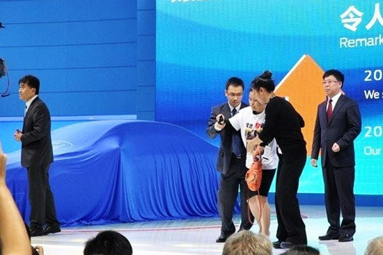 11月21日是2013广州车展的媒体日。长安福特展台正在进行媒体发布会时,一名身着印有翼虎断轴照片T恤、手持相关维权材料的女车主突然走上展台,指责翼虎存在质量问题,车轴意外断裂。而她虽然一直与4S店及厂商积极沟通,却始终未得到正面回应。女车主现场维权不久便引来大批人员围观,现场安保人员迅速将其带离展台。