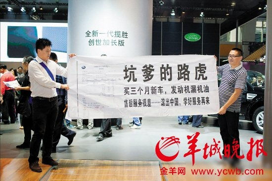 11月22日,两名打着横幅的男青年出现在路虎展台上。标题为“坑爹的路虎”的横幅引来围观。横幅上写着“买三个月新车,发动机漏机油,售后服务很差……滚出中国,学好服务再来”。很快这两名男子便被几个穿着制服的保安带离。
