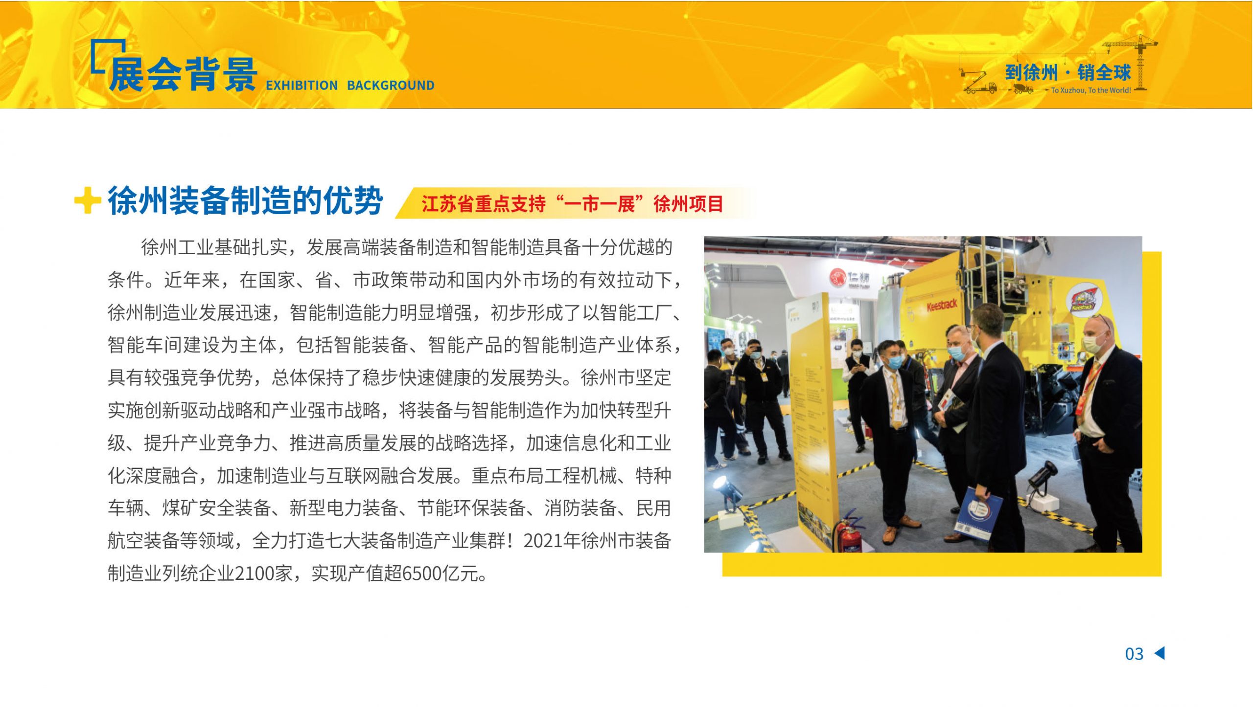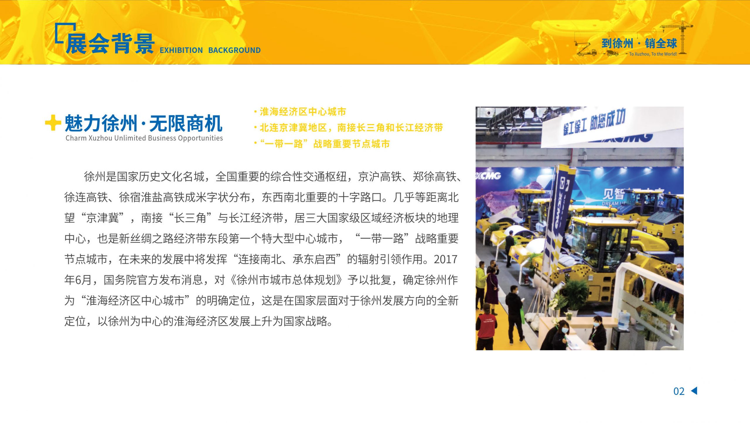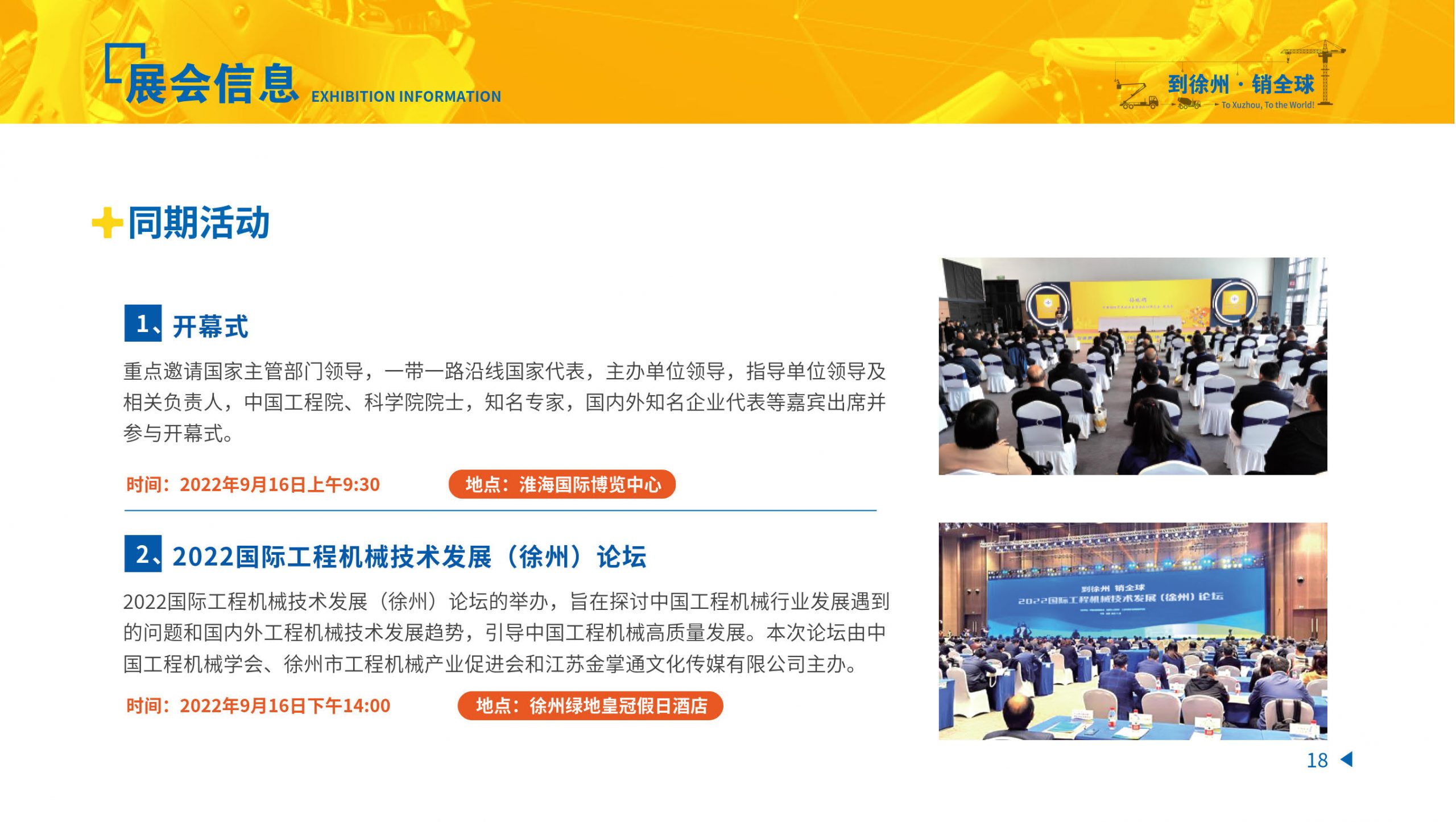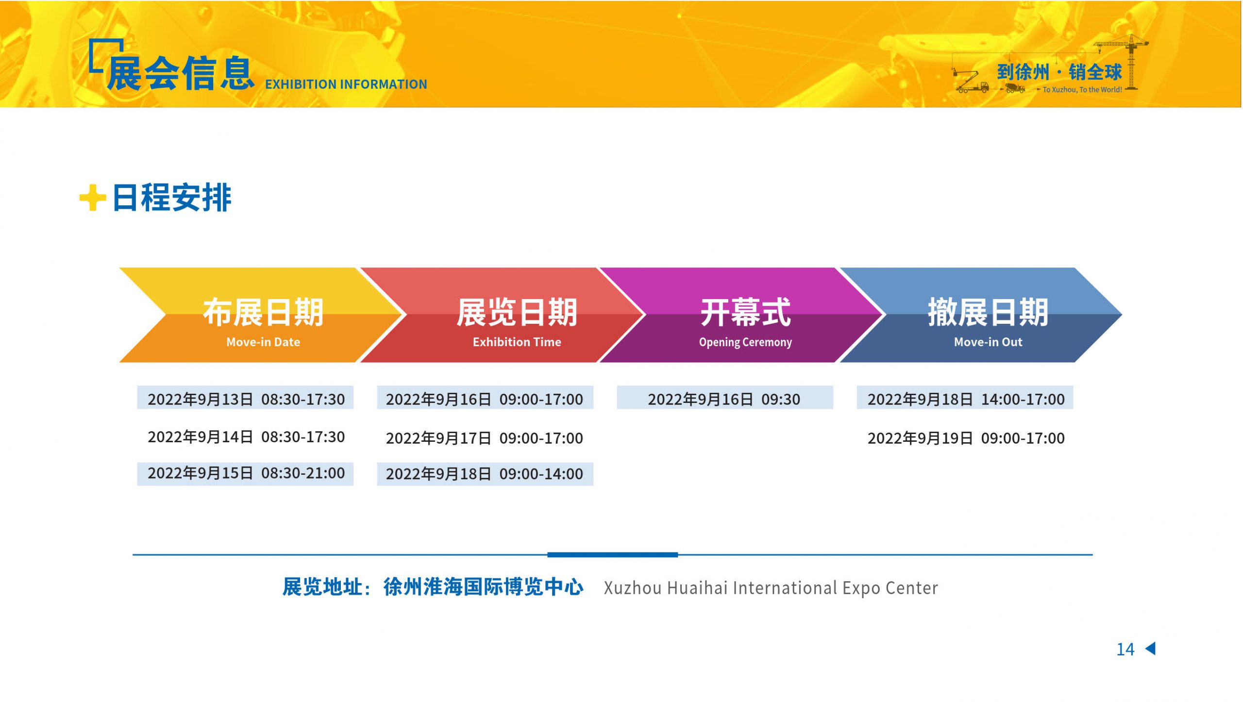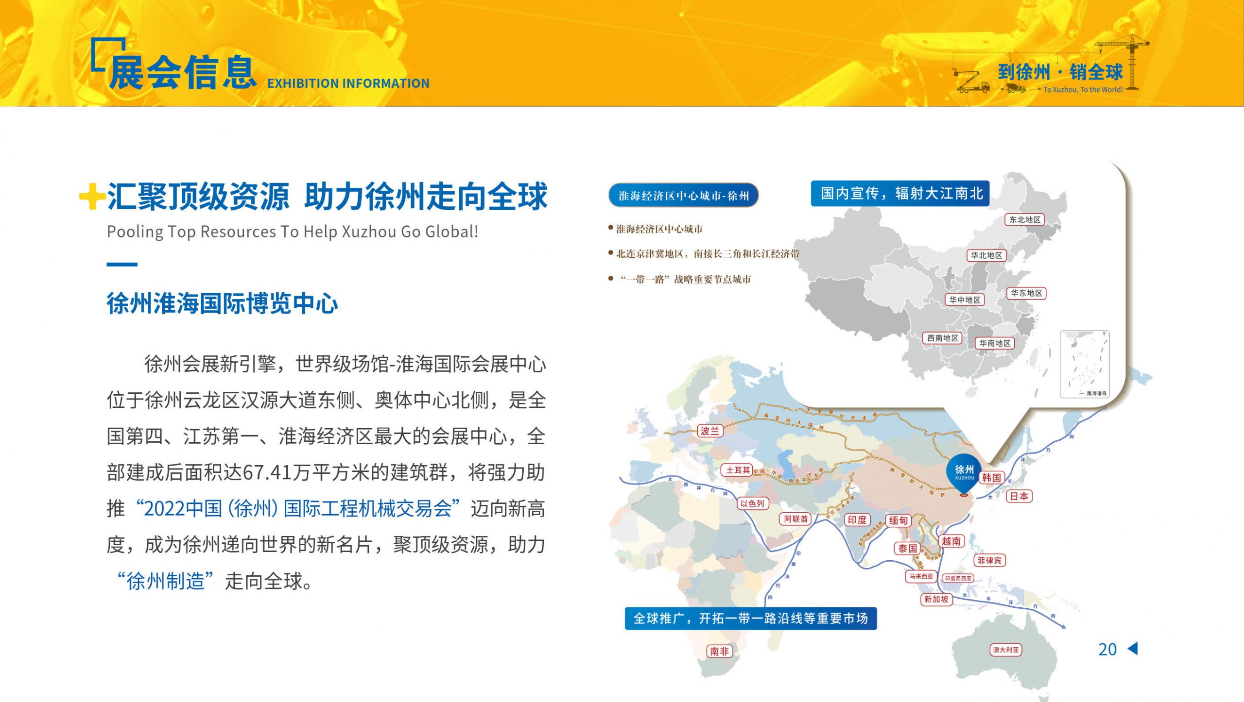 2022中国(徐州)国际工程机械交易会将于2022年9月16-18日在徐州淮海国际博览中心举办,展会主题为“起步,与世界同步”,预计使用展览总面积70000平方米,参展企业约1000家,预计吸引观众约10万人次。展会以“推动行业、引领企业、服务市场”为主旨,以“专业化、市场化、品牌化”的办展方针,提升企业创新能力和国际竞争力,将徐州“工程机械产业集群”培育打造成世界先进制造业集群。