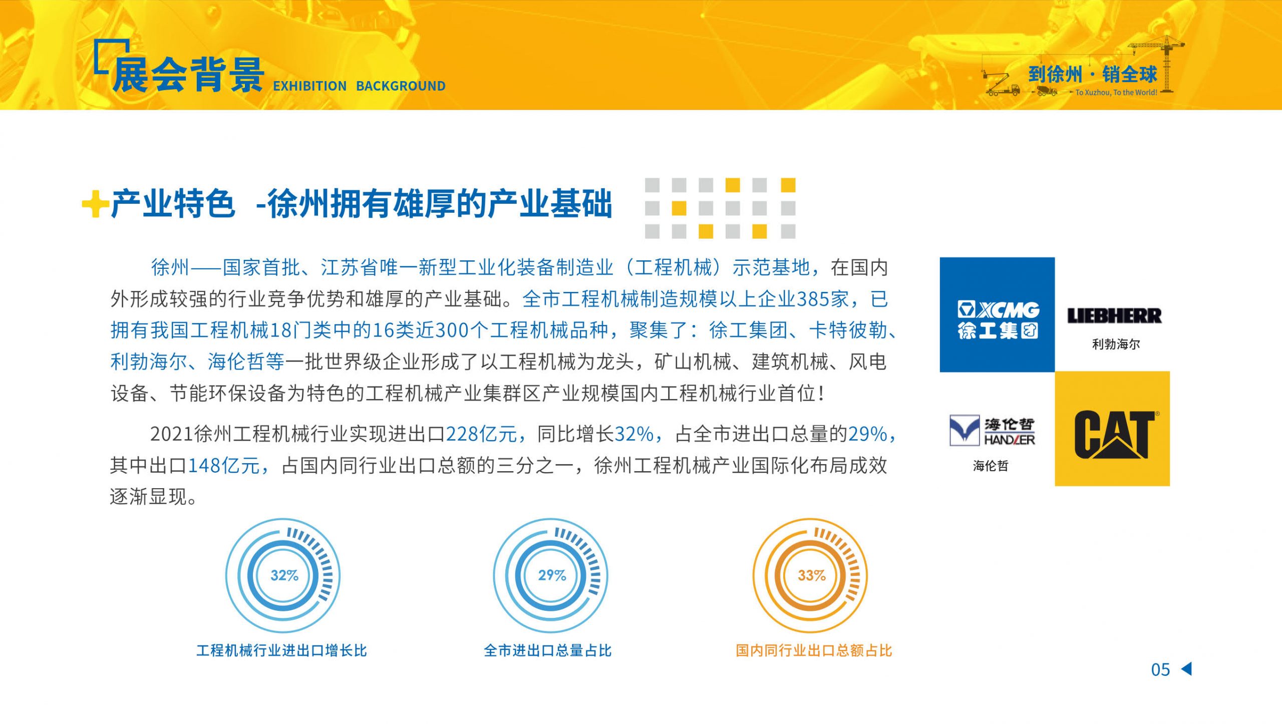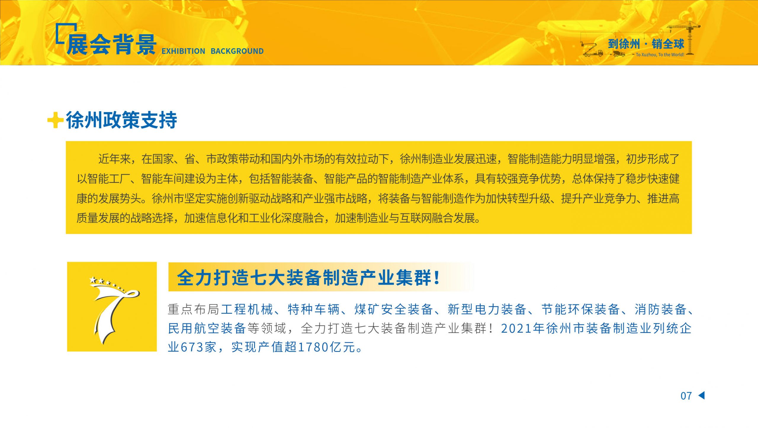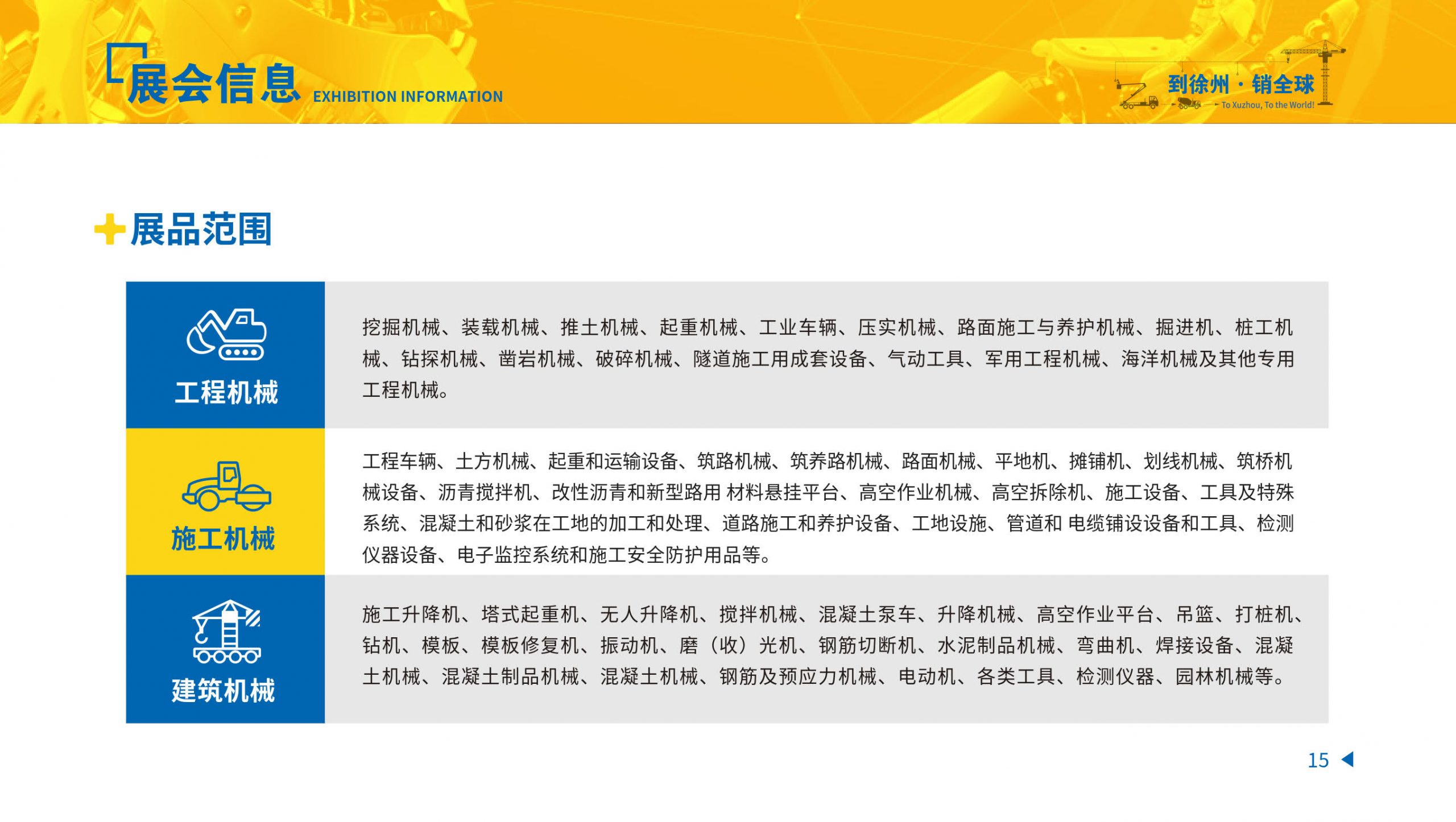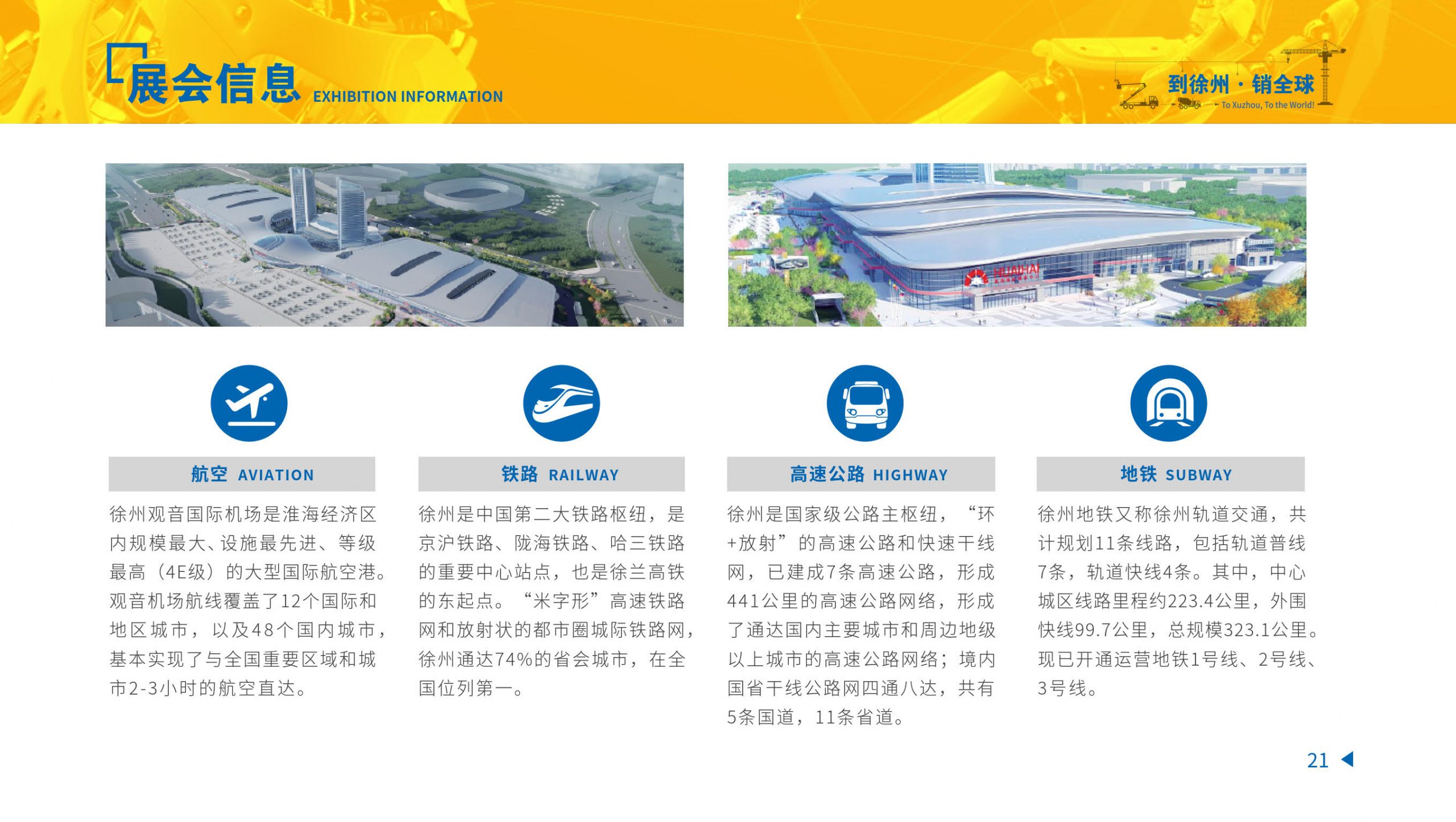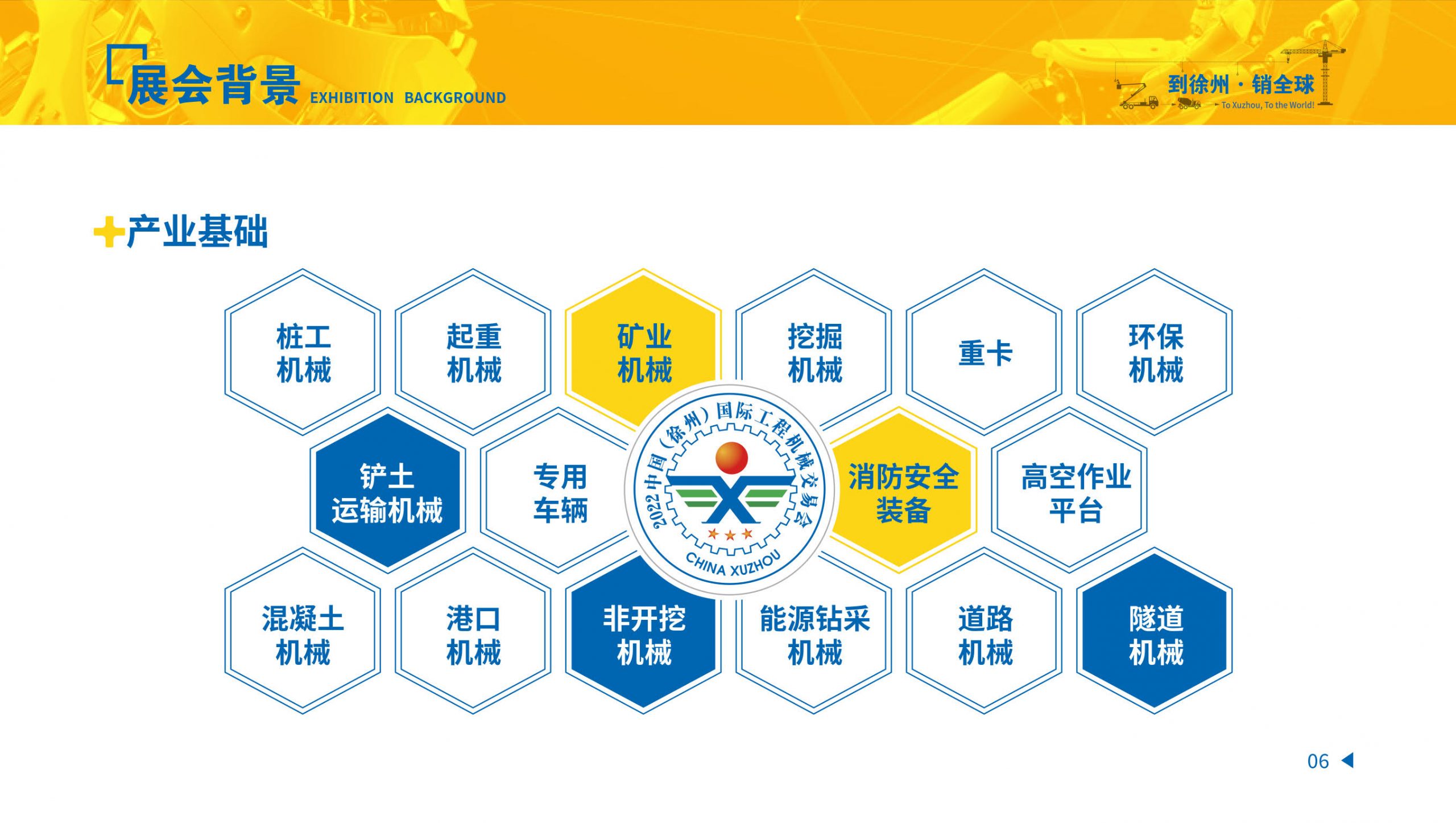 2022中国(徐州)国际工程机械交易会将于2022年9月16-18日在徐州淮海国际博览中心举办,展会主题为“起步,与世界同步”,预计使用展览总面积70000平方米,参展企业约1000家,预计吸引观众约10万人次。展会以“推动行业、引领企业、服务市场”为主旨,以“专业化、市场化、品牌化”的办展方针,提升企业创新能力和国际竞争力,将徐州“工程机械产业集群”培育打造成世界先进制造业集群。