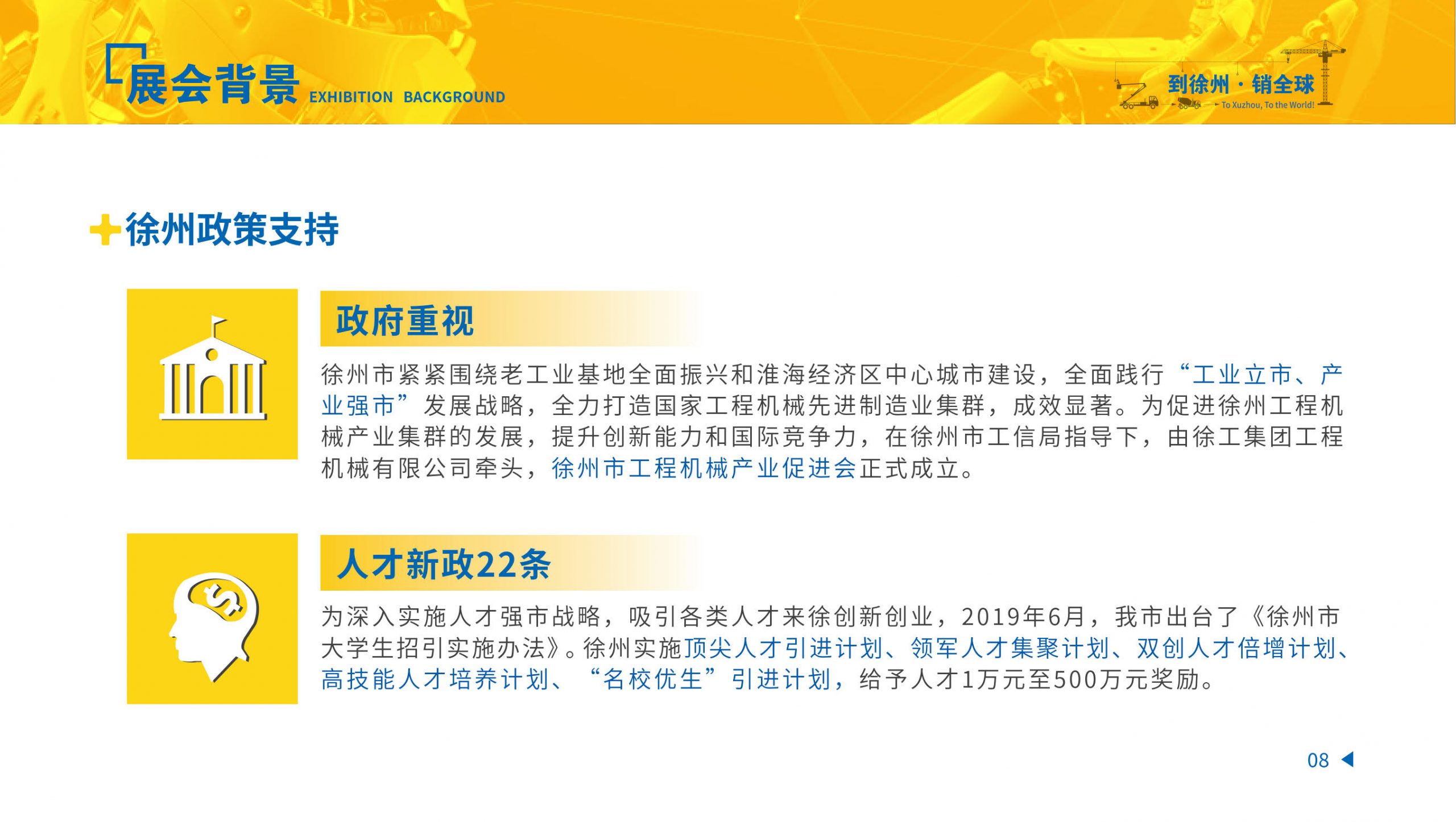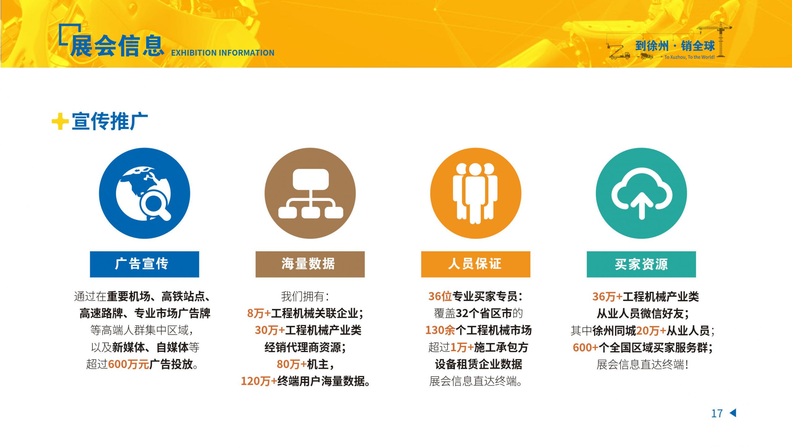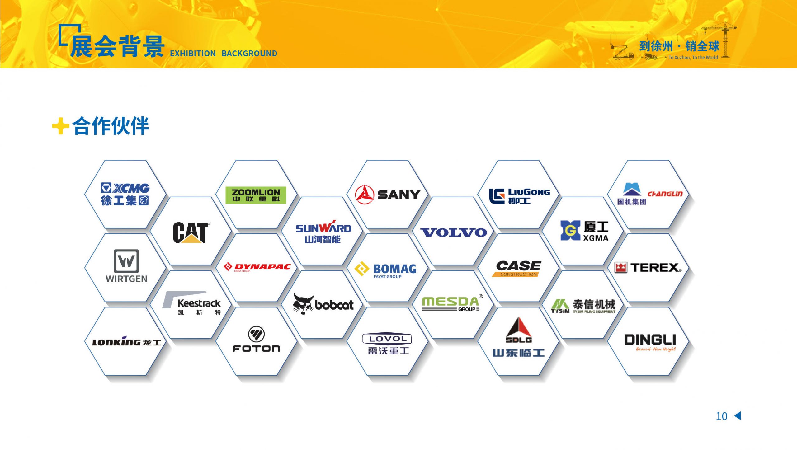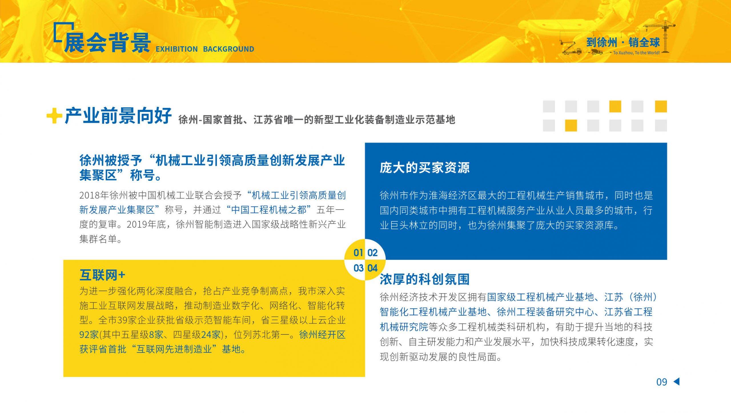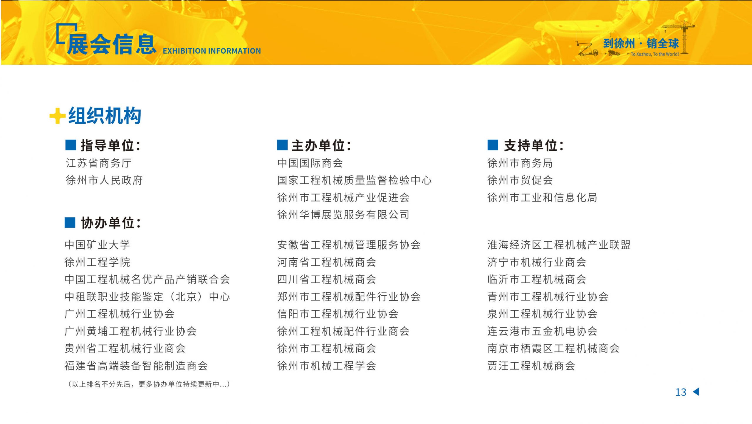 2022中国(徐州)国际工程机械交易会将于2022年9月16-18日在徐州淮海国际博览中心举办,展会主题为“起步,与世界同步”,预计使用展览总面积70000平方米,参展企业约1000家,预计吸引观众约10万人次。展会以“推动行业、引领企业、服务市场”为主旨,以“专业化、市场化、品牌化”的办展方针,提升企业创新能力和国际竞争力,将徐州“工程机械产业集群”培育打造成世界先进制造业集群。