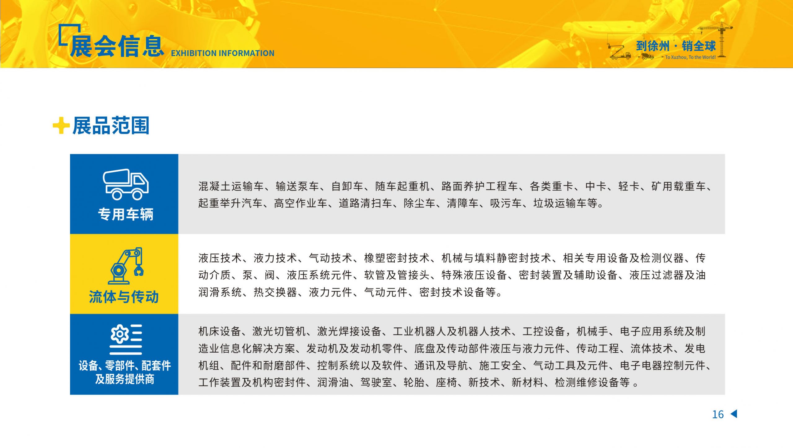 展会将集中展示工程机械、建筑机械、施工机械、专用车辆、零部件等产品,重点突出品牌展示、工程采购、技术交流、政策支持四大功能平台,进一步引领行业发展,培育新兴市场,为政府和市场提供投资、建设、运营一体化综合服务平台从而提高品牌影响力、企业经济竞争力、行业可持续发展。