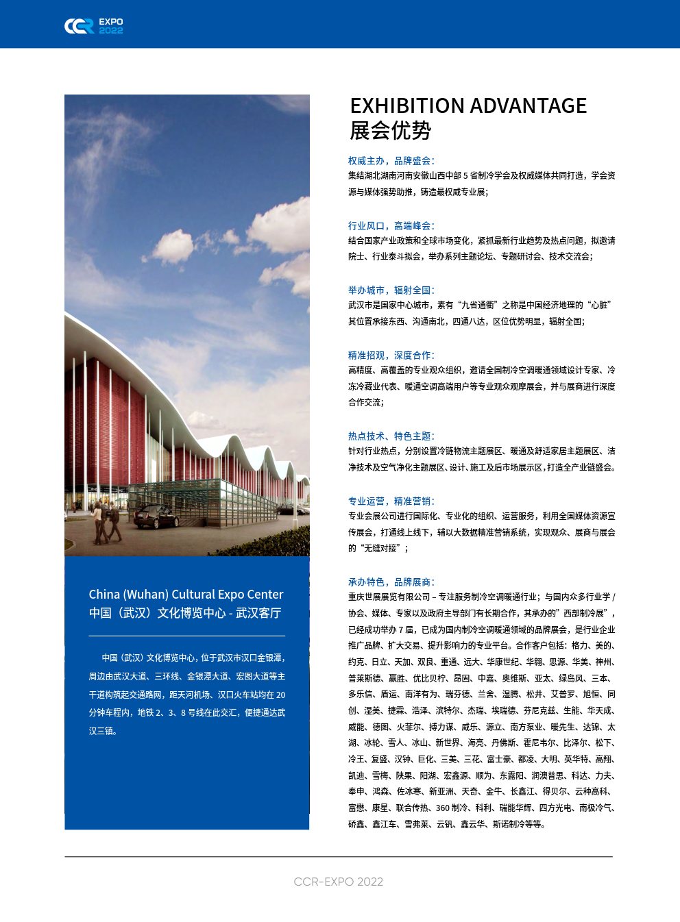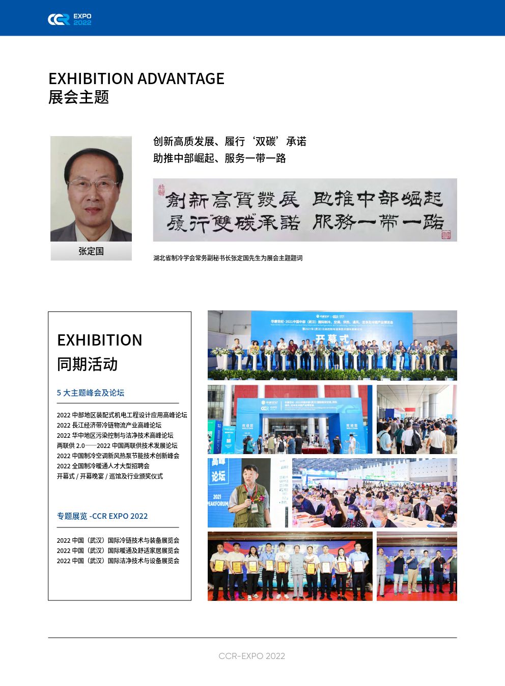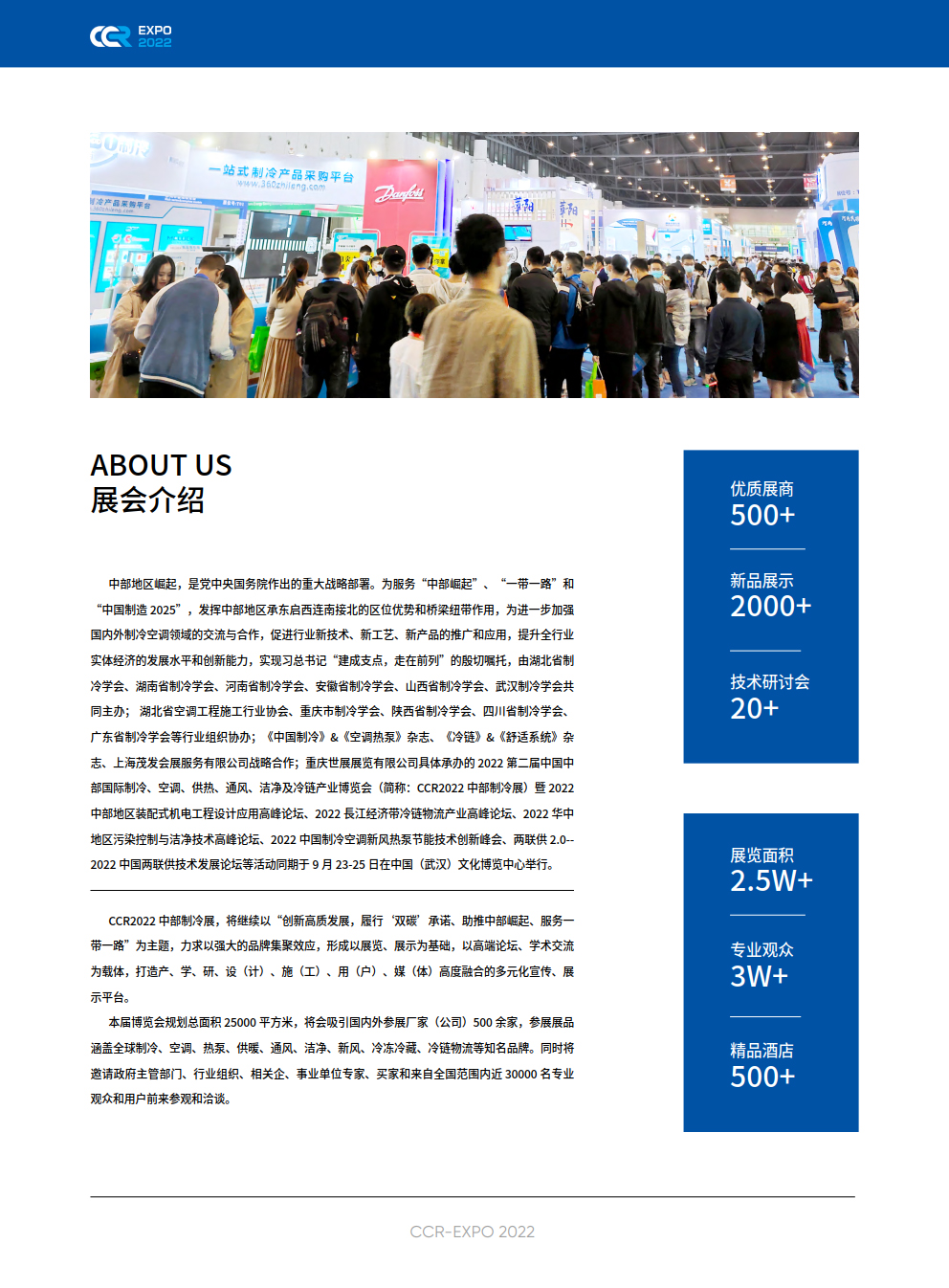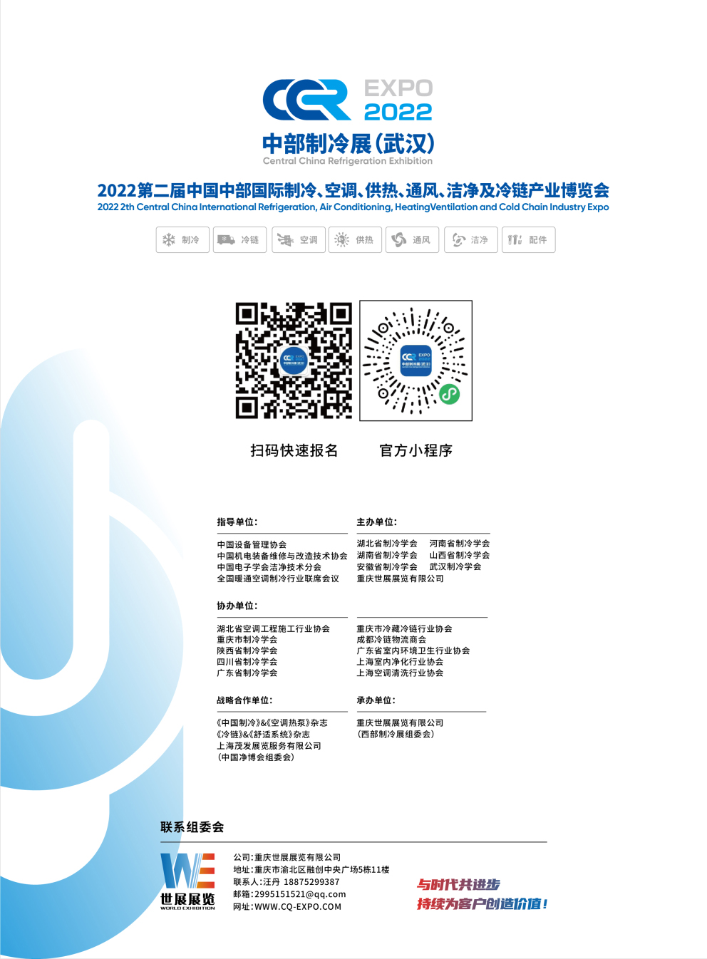 中部地区崛起,是党中央国务院作出的重大战略部署。为服务“中部崛起”、“一带一路”和“中国制造 2025”,发挥中部地区承东启西连南接北的区位优势和桥梁纽带作用,为进一步加强国内外制冷空调领域的交流与合作,促进行业新技术、新工艺、新产品的推广和应用,提升全行业实体经济的发展水平和创新能力,实现习总书记“建成支点,走在前列”的殷切嘱托,由湖北省制冷学会、湖南省制冷学会、河南省制冷学会、安徽省制冷学会、山西省制冷学会、武汉制冷学会共同主办; 湖北省空调工程施工行业协会、重庆市制冷学会、陕西省制冷学会、四川省制冷学会、广东省制冷学会等行业组织协办;《中国制冷》&《空调热泵》杂志、《冷链》&《舒适系统》杂志、上海茂发会展服务有限公司战略合作;重庆世展展览有限公司具体承办的2022第二届中国中部国际制冷、空调、供热、通风、洁净及冷链产业博览会(简称:CCR2022 中部制冷展)暨2022中部地区装配式机电工程设计应用高峰论坛、2022長江经济带冷链物流产业高峰论坛、2022华中地区污染控制与洁净技术高峰论坛、2022中国制冷空调新风热泵节能技术创新峰会、两联供2.0--2022中国两联供技术发展论坛等活动同期于9月23-25日在中国(武汉)文化博览中心举行。