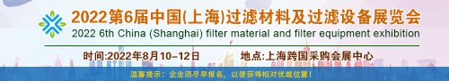 2022中国(上海)过滤材料及过滤设备展览会,将于2022年8月在上海跨国采购会展中心举行,本届展会将以“创造客户价值与引领产业发展”为主题,集中展示过滤材料及设备在石油、化工、电力、冶金、环保、水处理、制药、卫生、防疫、食品、烟草、精细化工、汽车、能源、市政、造纸、印染、水泥、钢铁、油漆、喷涂、电器、新风系统、空气净化、空调、陶瓷、环境工程等行业内的巨大市场和发展前景。