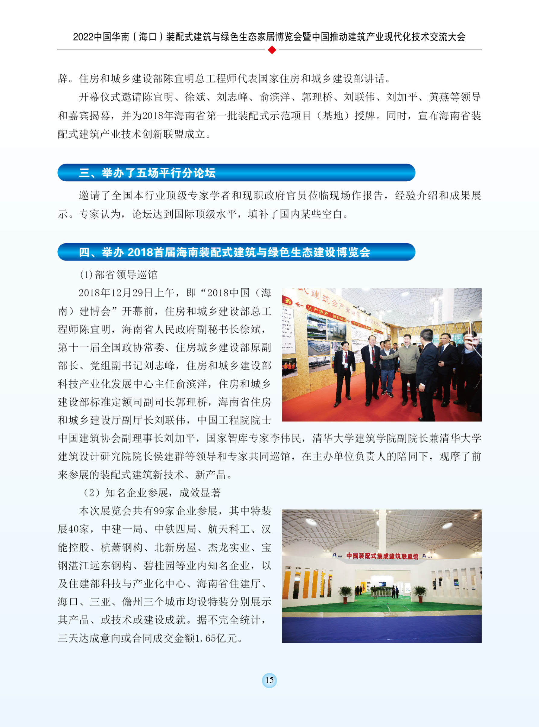 本届“建博会”将万商云聚、盛况空前。预计各省市住房 和城乡建设主管部门领导,各省市装配式建筑工作主管单位和 机构负责人,有关开发、科研、设计、施工、建材部品生产、 设备制造、咨询服务等相关单位负责人及管理和技术人员,有 关国家住宅产业化基地、房地产投资、开发、建设与运用管理 企业高管,国家综合试点城市,中国特色产业小镇投资开发建 设与施工单位负责人、国内外知名房地产开发、建筑设计施工 企业、上下游产业链产品部件供应商与技术研发机构代表,以 及海南省当地主管部门负责人、海南省房地产开发、建筑设计、施工企业负责人,海南各产业园区、装配式建筑示范项目、示 范基地负责人等。参观观众(现场)预计8万人次,线上预计20万 人次。