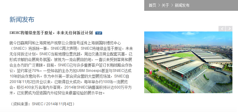 当日,上海新国际博览中心官网发布消息称:SNIEC将继续坐落于原址,未来无任何拆迁计划。
