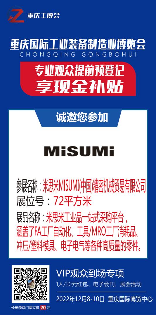 导读:以展示“智能化、自动化、信息化、数字化”等新技术新理念,汇聚来自世界各地科研及工业领域的专家学者,携手展示创新的尖端技术及解决方案工程平台。 展会涵盖了智能工厂、汽车制造、动力传动、智慧物流、数控机床、金属切割、工业机器人、工业 装配自动化、工业传输、机器视觉、3C电子等领域,直接并全面服务于智能制造行业从源头到终端的整条产业链。上届展会面积达到40000,参展企业500家,专业观众4000人次。将全力以赴为参展商 创造更大的价值,我们力争将重庆工业博览会打造成西南部行业国际盛会。参展企业:米思米(中国)精密机械贸易有限公司参展时间/地点:2022年12月8-10日重庆国际博览中心参展展品:米思米工业品一站式采购平台,“制胜时间 助力智造”。涵盖了FA标准件、MRO、生产加工、电子电气、冲压/塑模等各种高质量零件。米思米以高品质、低价格、短交期、准时送达为理念,致力成为全球制造业发展。关于米思米(中国)精密机械贸易有限公司总公司株式会社MISUMI,自1963年于日本成立以来、一直坚持向客户快速、准确地提供FA工厂自动化用零件、模具零件、电子部品、工具•消耗品等各种高质量的零件。通过独自汇编产品目录和建立直接销售产品的营销体制、创出了低成本的商务经营模式、并通过依据客户的意见和要求来制定每年的产品规划、持续开发具备高质量水平的MISUMI名牌产品。