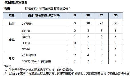 展位类型光地展位(18平方米起订)标准展位(9平方米起订)参展费用12,900人民币/9平方米13,700人民币/9平方米