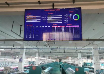 车间上方悬挂着生产管理看板,显示着产品工单进度、断线次数、机器状态、机器稼动率等。绣花设备花型通过物联网控制中心无线传输,控制系统对机台生产进度和断线率等生产数据进行实时收集与处理。