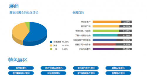 展会产品涉及:医学影像、医疗器械/设备、临床医学、康复理疗、辅料耗材、家用医疗、医疗电子、医用信息化、智能医疗、医疗行业服务等医疗全产业链产品;展会坚持走国际化,专业化的特色发展道路,以推动产业升级、行业创新发展为己任,为国内外买家采购交流提供一个医疗行业的饕餮盛宴!