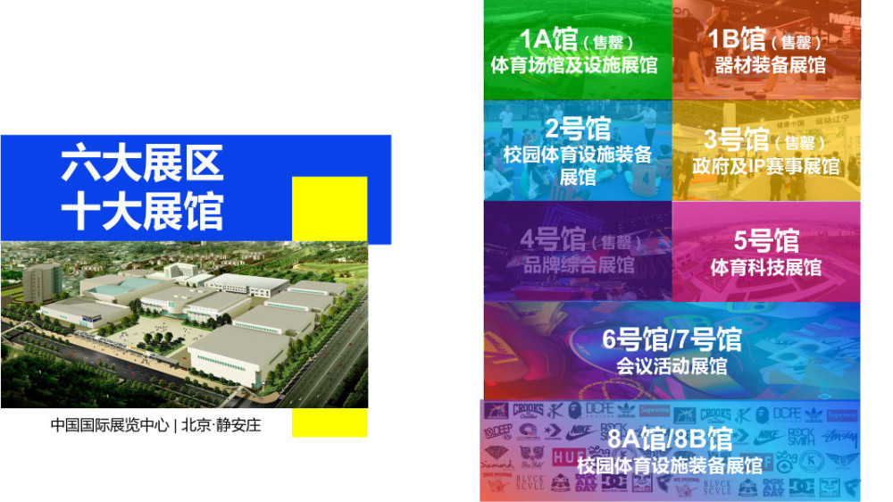 1、体育场馆及设施展区: 场馆设施/场馆系统/ 场馆设计运营服务/运动地板/草 坪/照明/泳池等
