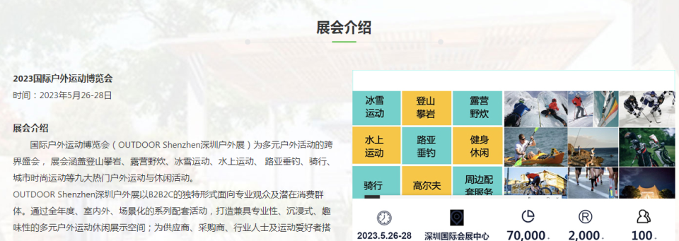 深圳国际户外运动博览会(OUTDOOR Shenzhen深圳户外展)为多元户外活动的跨界盛会, 展会涵盖登山攀岩、露营野炊、冰雪运动、水上运动、 路亚垂钓、骑行、城市时尚运动等九大热门户外运动与休闲活动。