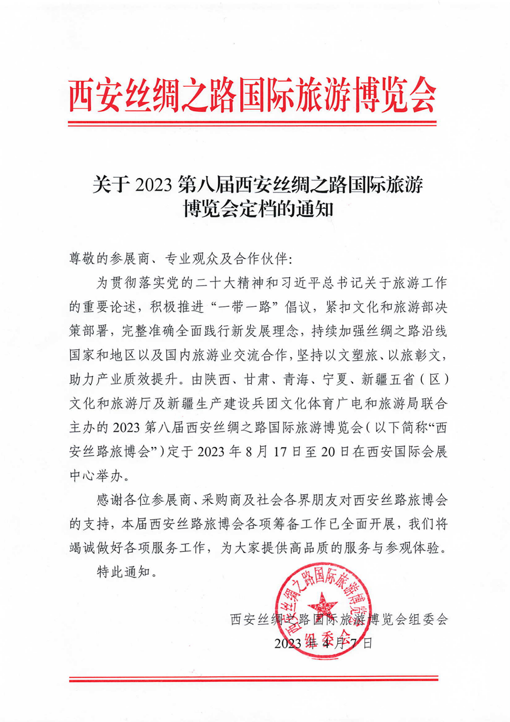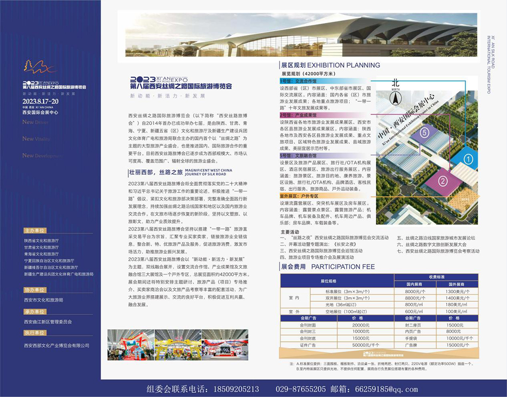 由陕西、甘肃、青海、宁夏、新疆五省(区)文化和旅游厅及新疆生产建设兵团文化体育广电和旅游局联合主办的2023第八届西安丝绸之路国际旅游博览会(以下简称“西安丝路旅博会”)将于8月17日至20日在西安国际会展中心举办(西安浐灞生态区会展一路 1399 号)。