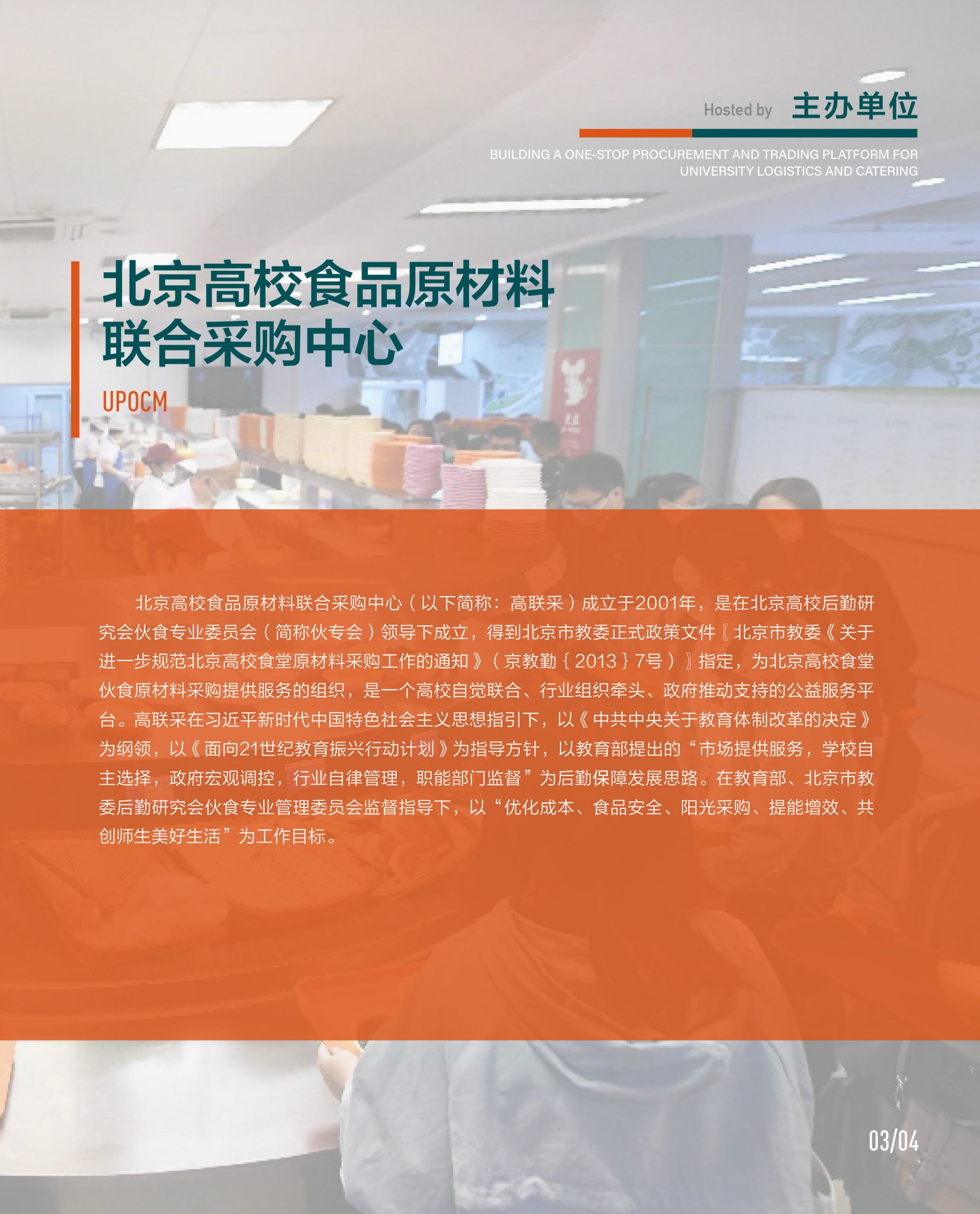 北京高校食品原材料联合采购中心(以下简称:高联采)成立于2001年,是在北京高校后勤研究会伙食专业委员会(简称伙专会)领导下成立,得到北京市教委正式政策文件〖北京市教委《关于进一步规范北京高校食堂原材料采购工作的通知》(京教勤{2013}7号)〗指定,为北京高校食堂伙食原材料采购提供服务的组织,是一个高校自觉联合、行业组织牵头、政府推动支持的公益服务平台。高联采在习近平新时代中国特色社会主义思想指引下,以《中共中央关于教育体制改革的决定》为纲领,以《面向21世纪教育振兴行动计划》为指导方针,以教育部提出的“市场提供服务,学校自主选择,政府宏观调控,行业自律管理,职能部门监督”为后勤保障发展思路。在教育部、北京市教委后勤研究会伙食专业管理委员会监督指导下,以“优化成本、食品安全、阳光采购、提能增效、共创师生美好生活”为工作目标。