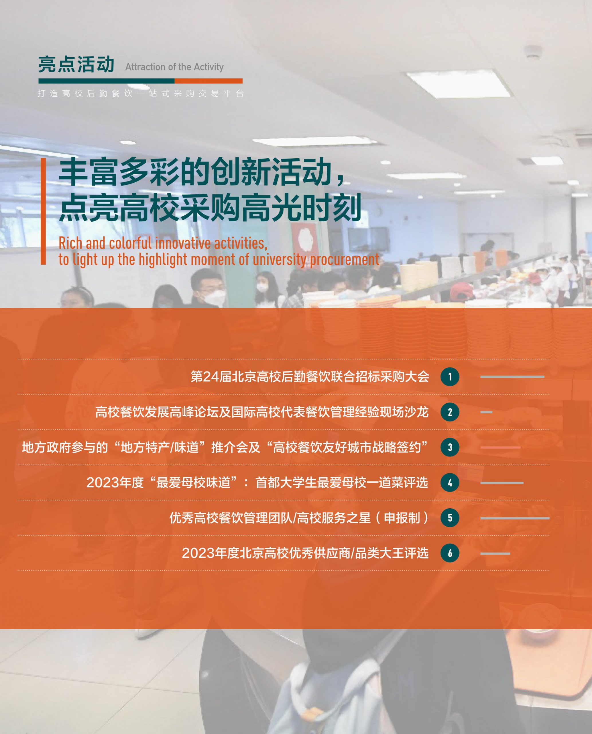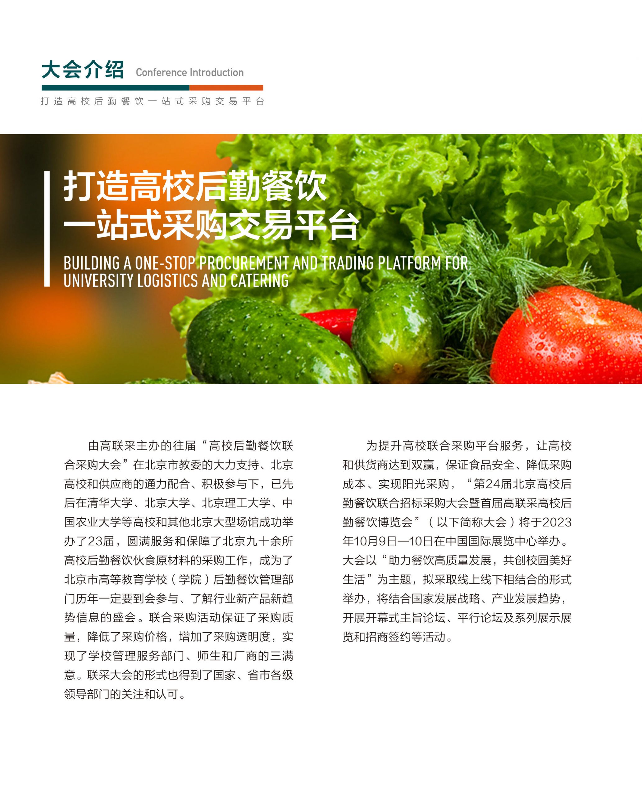 为提升高校联合采购平台服务,让高校和供货商达到双赢,保证食品安全、降低采购成本、实现阳光采购,“第24届北京高校后勤餐饮联合招标采购大会暨首届高联采高校后勤餐饮博览会”(以下简称大会)将于2023年10月9日—10日在中国国际展览中心举办。大会以“助力餐饮高质量发展,共创校园美好生活”为主题,拟采取线上线下相结合的形式举办,将结合国家发展战略、产业发展趋势,开展开幕式主旨论坛、平行论坛及系列展示展览和招商签约等活动。