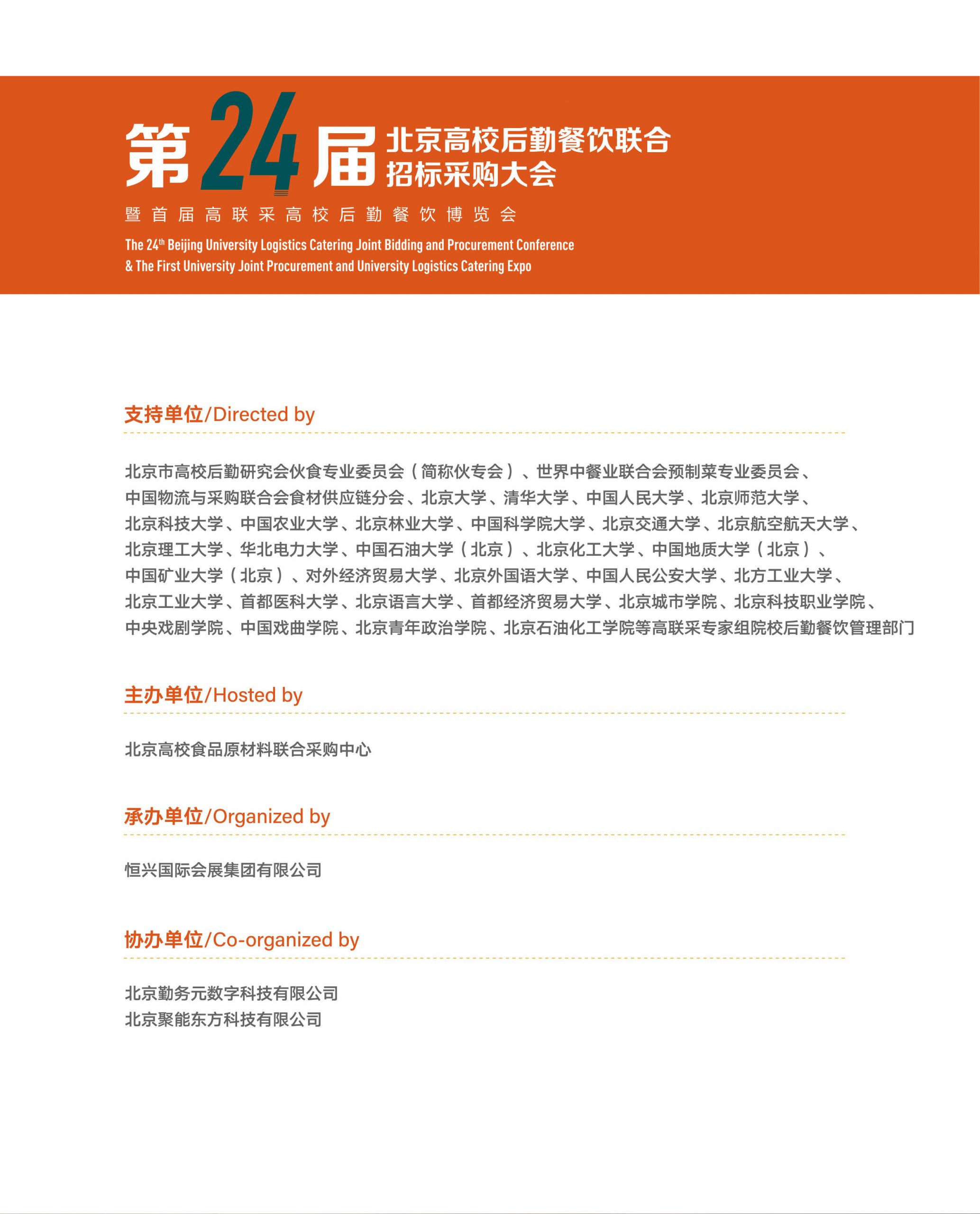 北京市教育委员会、北京市高校后勤研究会伙食专业委员会(简称伙专会)、世界中餐业联合会预制菜专业委员会、中国供销集团、中国供销电子商务有限公司(832平台)、中国物流与采购联合会食材供应链分会、北京大学、清华大学、中国人民大学、北京师范大学、北京科技大学、中国农业大学、北京林业大学、中国科学院大学、北京交通大学、北京航空航天大学、北京理工大学、华北电力大学、中国石油大学(北京)、北京化工大学、中国地质大学(北京)、中国矿业大学(北京)、对外经济贸易大学、首都经济贸易大学、北京城市学院、北京科技职业学院、中央戏剧学院、中国戏曲学院、北京青年政治学院、北京石油化工大学等高联采常务理事会院校后勤餐饮管理部门