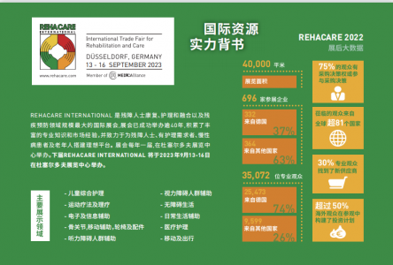 2023国际康复设备与解决方案展览会(REHACARE SHANGHAI)由德国杜塞尔多夫展览集团公司引入中国市场并由其子公司杜塞尔多夫展览(上海)有限公司主办。展会以“融合Driving Inclusion”为使命,致力于为中国的残障人士及其他康复需求人群建立专业的交流平台,促进残障人士深度社会融合。展会展示范围汇集智能康复,儿童康复,运动康复,骨关节辅助,沟通和信息辅助,移动辅助,康复设备及治疗,无障碍生活,医疗护理等领域,为康复全产业链构建精准的国际采供对接及交流平台。