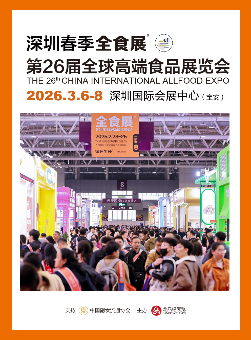 第26届全球高端食品展览会 (全食展) 将于2026年3月6-8日,在深圳国际会展中心 (宝安) 举行。同期将举办2026春季中国糖果零食展览会、2026全国速冻食品及加工展览会、第21届中国冰淇淋冷食展览会、第7届中国饮品产业展览会、2026全国食品机械与包装展览会,规划展出面积15万平米,预计专业观众18万人次。届时,来自30多个国家和地区的2800+家食品饮料、速冻食品、冰淇淋品牌前来参展,各个细分领域的头部品牌将逐一亮相,联合发布2万余款2026年度新品。