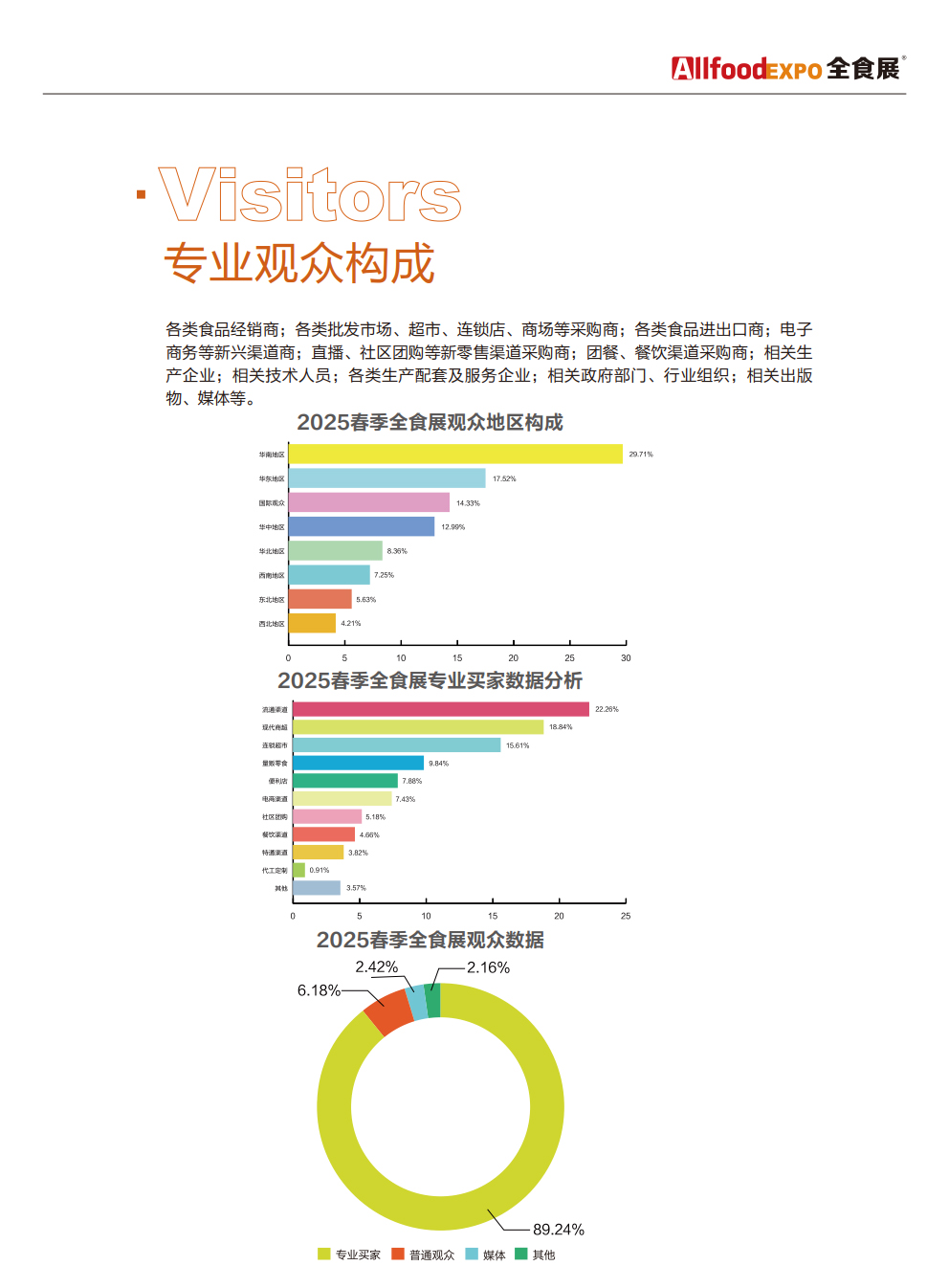 各类高端食品饮料;糖果、巧克力、果冻、糕饼、炒货、蜜饯、豆制品及肉制品等休闲食品;卡通食品、进口食品;乳制饮料、酒精饮料、软饮料、咖啡、茶、饮用水等;常温、低温乳品及制品等;冰淇淋、冷冻冷藏食品;预制菜、餐饮食材;植物基食品;原料及配料;加工及包装设备;包装材料及印刷;模具及配套设备;安全检测设备及物流运输服务;媒体及相关培训机构等。