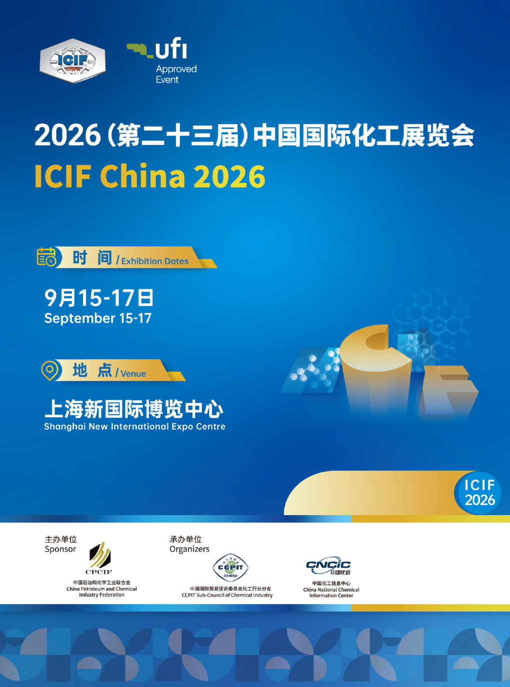 2026年9月15日- 17日,第二十三届中国国际化工展览会(ICIF China 2026)将在上海新国际博览中心盛大举办。展会将汇聚能源与石油化工、基础化学品、化工新材料、精细化工、化工安全与环保、化学品包装与储运、化工工程与装备、数字化-智能制造、化学试剂与实验室设备、科研成果及相关服务等知名企业的数万种产品和先进技术,是企业宣传新产品、新技术、新装备和新成就的重要平台,展示当前能源和石油化工行业加快培育和发展新质生产力的重要成果。