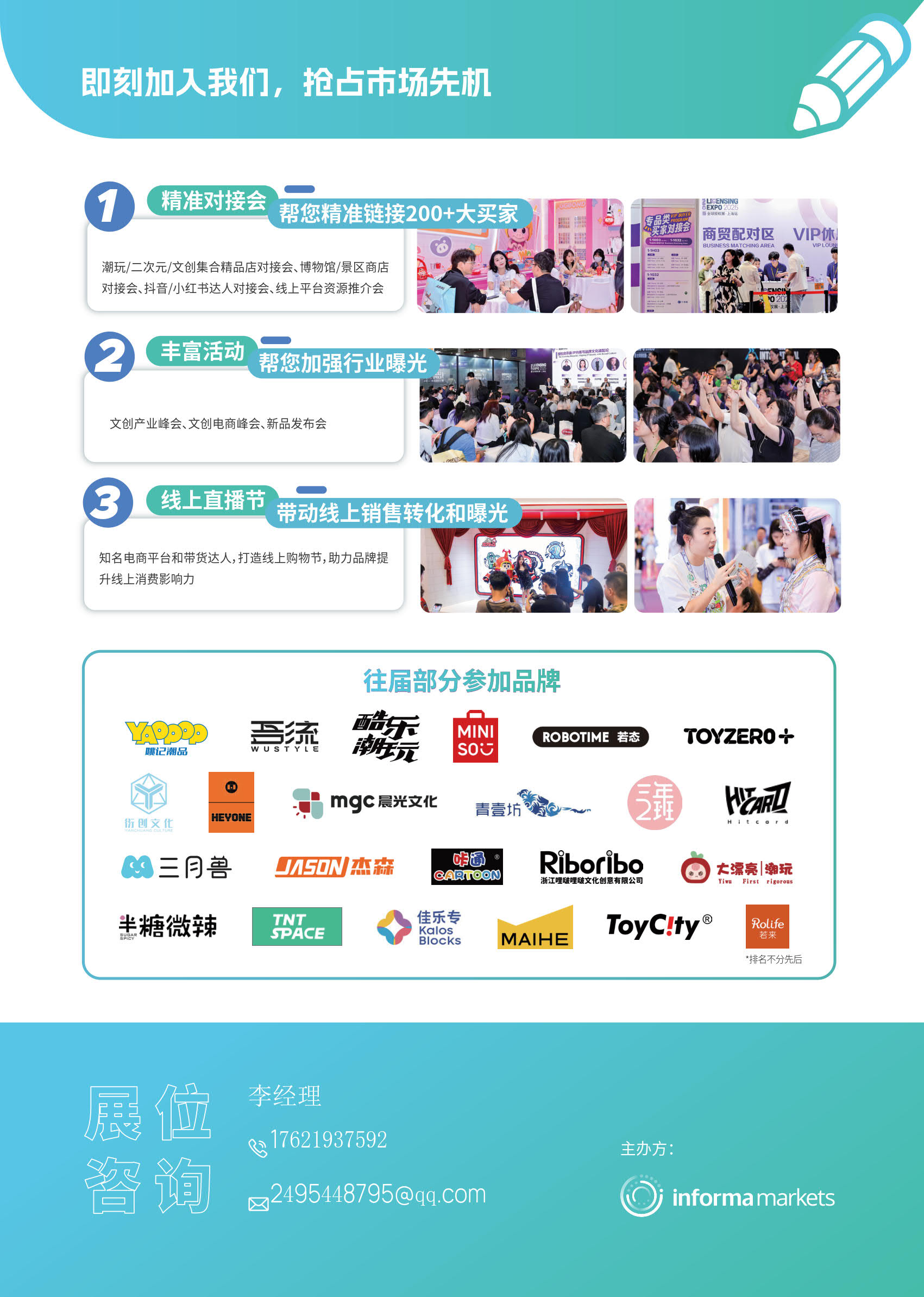 内容摘要: 上海文创生态展览会 Shanghai Cultural Creative Innovation Expo 文创全产业链商贸对接平台 同期:全球授权展 .上海展 2026.7.15-17 国家会展中心(上海) 主办单位:英富曼informa markets 展会规模:……