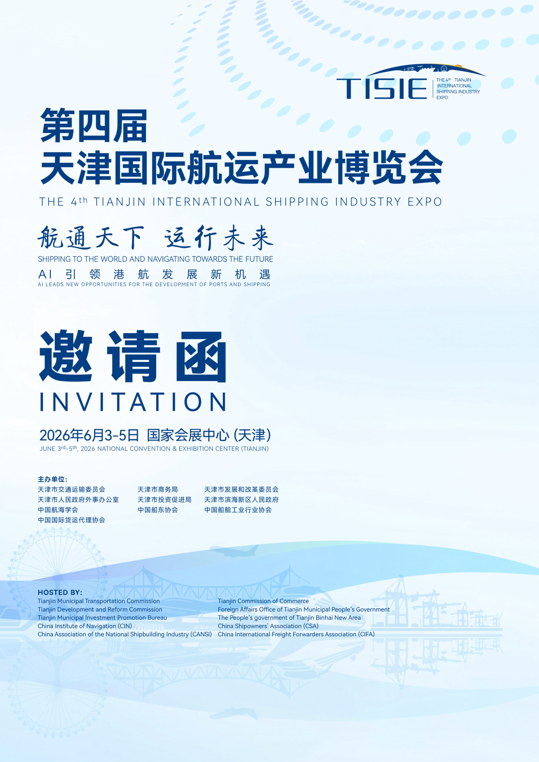 2026第四届天津国际航运产业博览会,诚邀全球航运领域企业相聚天津,共享航运产业转型机遇,共绘绿色智慧航运新图景,携手推动全球航运业可持续发展,为构建更加高效、绿色、智能的未来航运体系贡献力量!