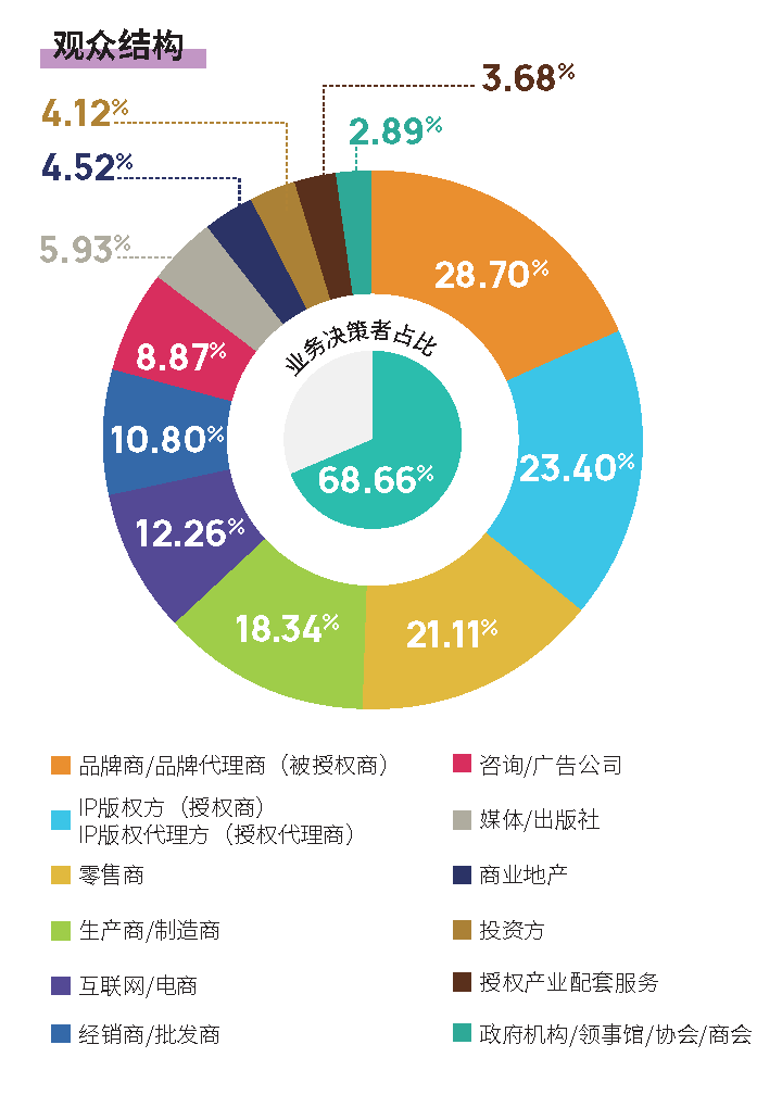 LEC授权展始终致力于汇聚高质量行业买家。上届展会现场,我们迎来了包括2025年LEC授权展现场接待了来自包括华润、KKV、X11、麦德龙、永辉超市、山姆、玩具反斗城、好特卖等零售商、渠道商以及百胜中国、日清食品、维达、CASETiFY、联合利华、科勒中国、老庙黄金、泸州老窖、卡乐比食品、OPPO、老乡鸡餐饮、美赞臣、海氏海诺等知名品牌,共计66,252名专业观众,其中业务决策者比例高达64.65%,覆盖玩具/礼品、鞋服配、日化、美妆、食品饮料、孕婴童、零售、商业地产、酒店等全产业链领域。