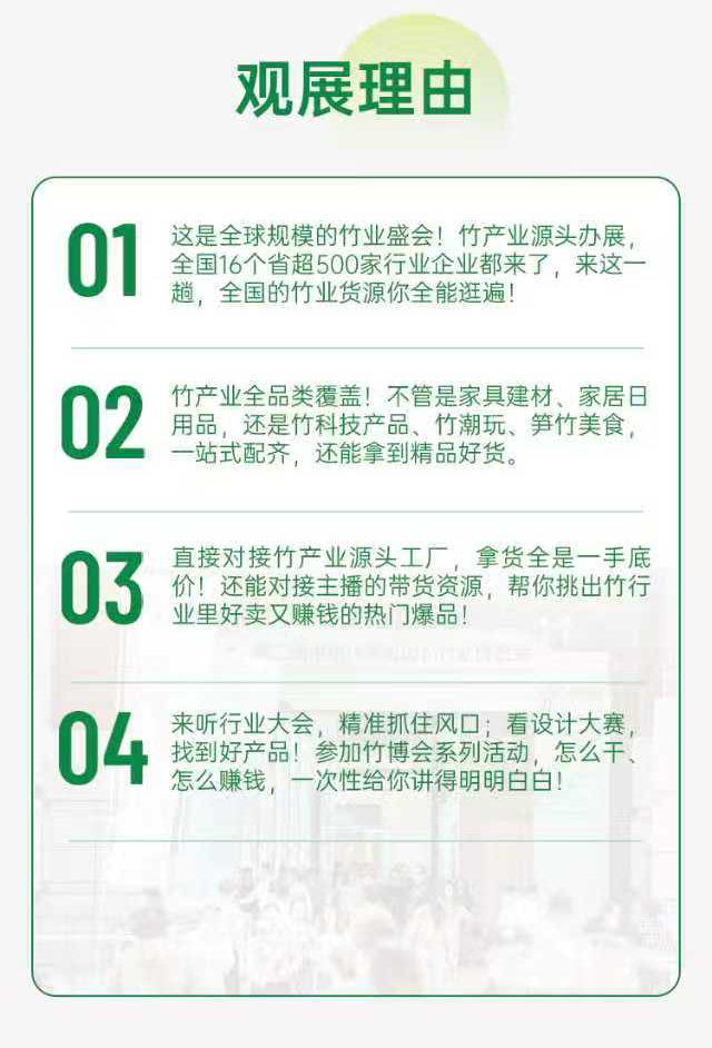 再度升级,规模空前。本届竹博会展会面积超过3万平方米,组织参展企业500家以上,并重点吸引4000名以上国内外优质采购商。展会将聚焦产业赋能与国际合作,通过专业化、国际化、创新化的平台,全面提升展商质量与采购对接效率,无论是从展览面积、参展企业数量,还是从采购商质量来看,规模均创历届新高。