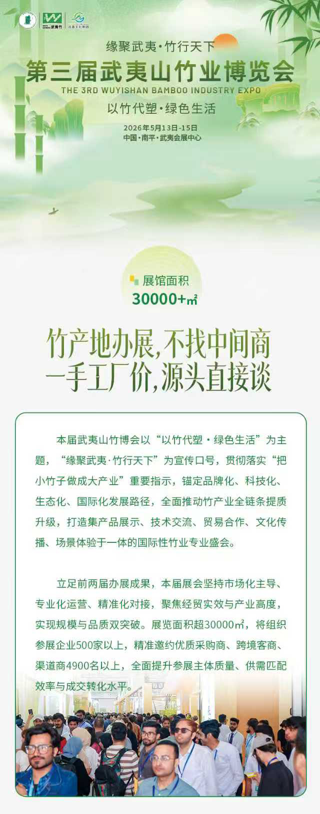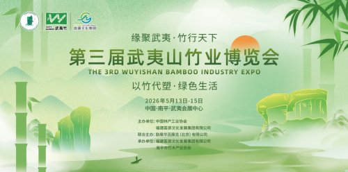 2026第三届武夷山竹业博览会将于5月13日-15日在中国南平武夷会展中心举办。以“以竹代塑·绿色生活”为主题,“以竹代塑·绿色增长”为核心理念,打造集产品展示、技术交流、贸易合作与文化传播于一体的国际性竹业盛会。