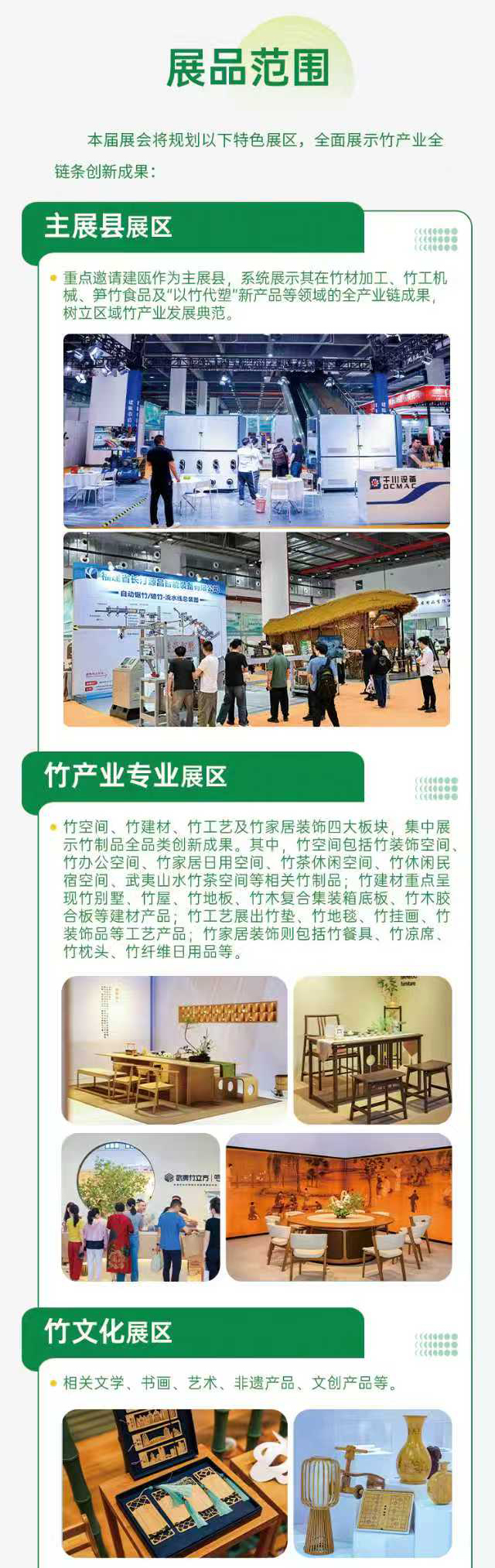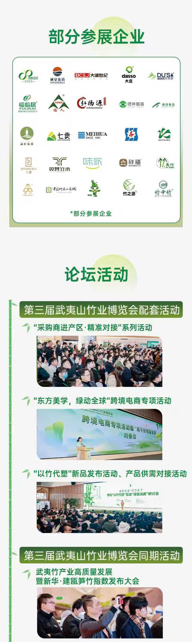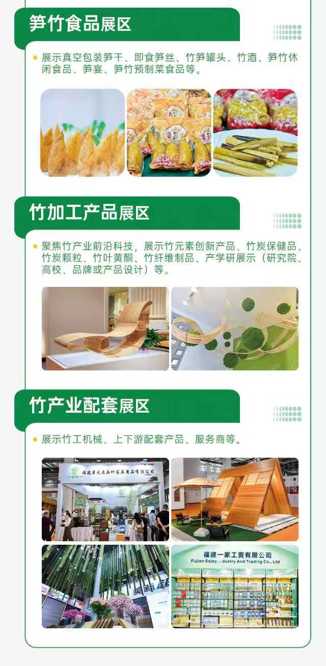 六大展区,全景展示。本届竹博会将全面呈现竹产业在资源培育、科技创新、精深加工、品牌建设等领域的卓越成果,集中展示 “武夷竹立方”“武夷笋” 的核心魅力。展会设置六大特色展区,展品涵盖竹空间、竹建材、竹工艺、竹家居、竹文化、竹科技、竹金融、竹健康、笋竹食品、竹工机械及上下游辅助产品、竹产业链配套服务等全竹品类。同期还将举办第三届“中国·海峡”武夷竹产业国际工业设计大赛、跨境电商活动、采购商进产区、新品供需对接会等一系列丰富多彩的配套活动,确保为参展企业与采购商带来最前沿的行业信息与最直接的商贸合作机会。