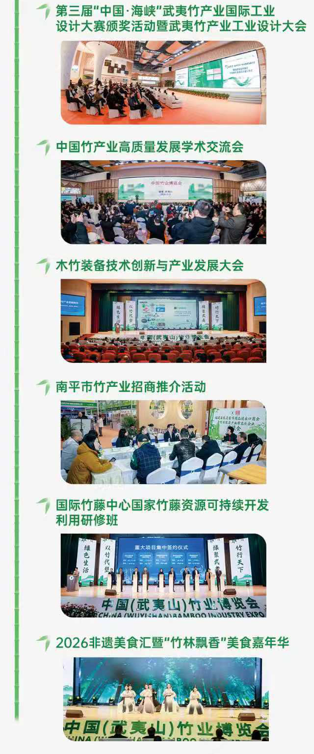 内容摘要: 2026第三届武夷山竹业博览会 将于5月13日-15日在中国南平武夷会展中心举办。以“以竹代塑·绿色生活”为主题,“以竹代塑·绿色增长”为核心理念,打造集产品展示、技术交流、贸易……
